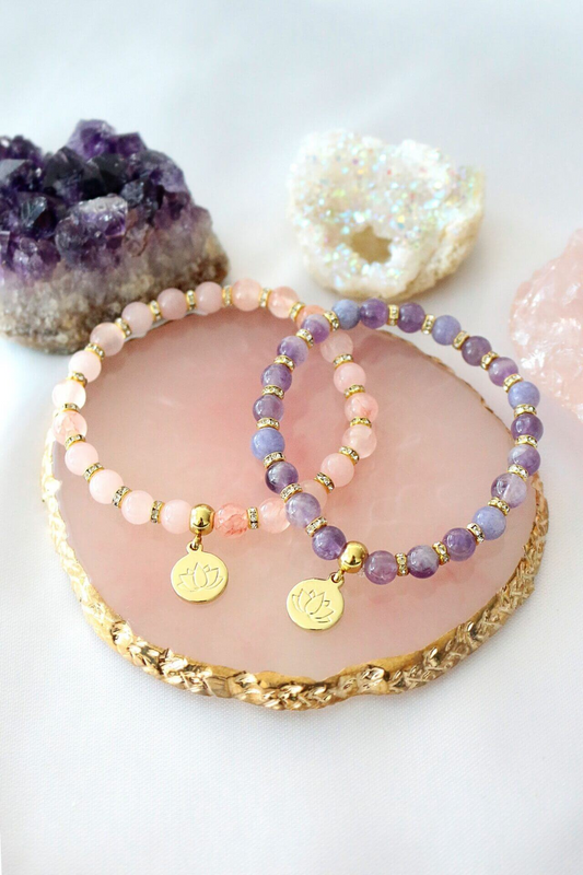 "Peace & Love" Rose Quartz - Amethyst Elastic Bracelet | 24K Lotus Flower Charm