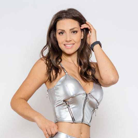 Shascullfites Melody Silver Leather Top Women Strong Push Up Bra Shapers Bodysuits Rock Style Tops For Women