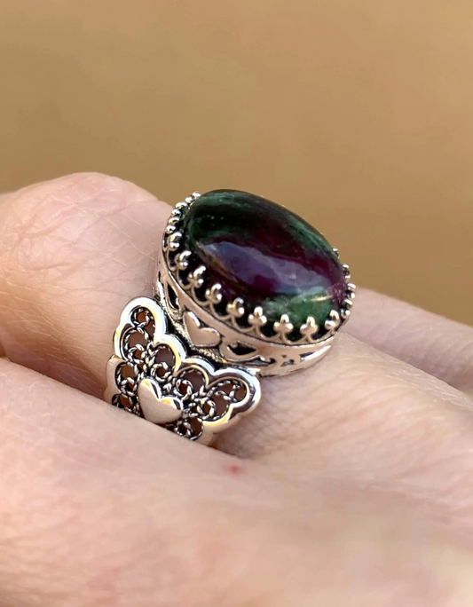 Ruby Zoisite Gemstone Double Heart Detailed Filigree Art 925 Sterling Silver Women Statement Ring