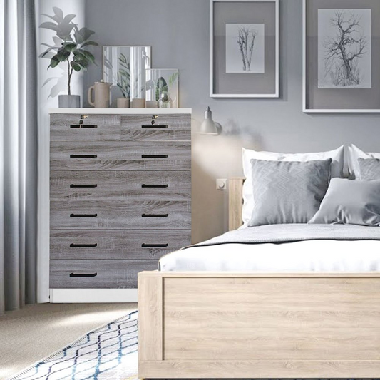 7 Drawer Chest Wooden Dresser with Lock (Gray + White)