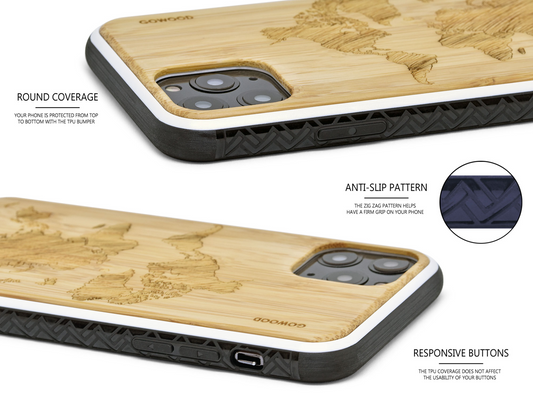 iPhone 11 Pro wood case world map engraved bamboo backside with TPU bumper