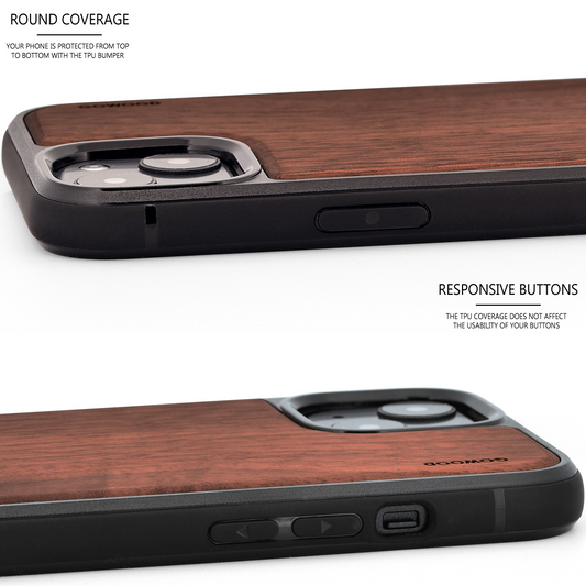 iPhone 13 Mini walnut wood case with TPU bumper and black PC