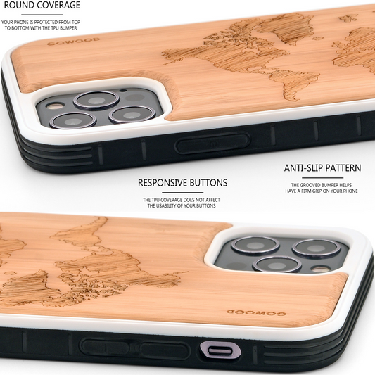 iPhone 12 and iPhone 12 Pro wood case world map engraved bamboo backside with TPU bumper