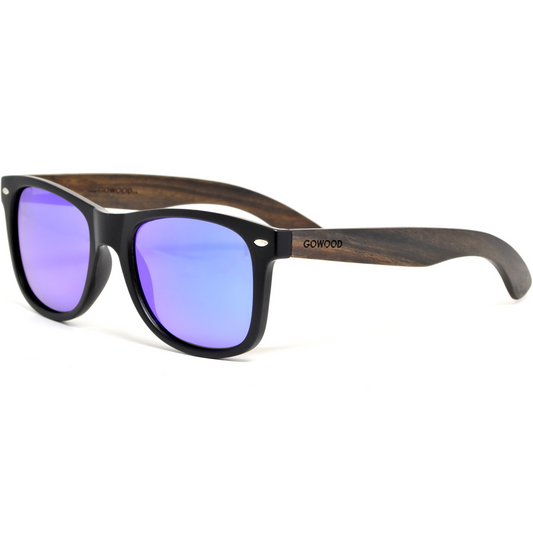 Ebony wood classic style sunglasses with blue mirrored polarized lenses