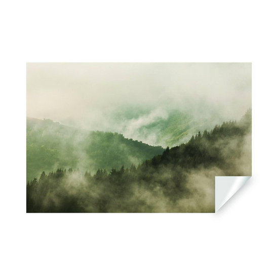Foggy Forest Wallpaper Sticker Mural - Mountain Tree Fog Removable Wall Paper Art Decal - Large Bedroom Decor Misty Pine Hill Peel Stick