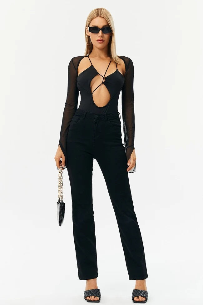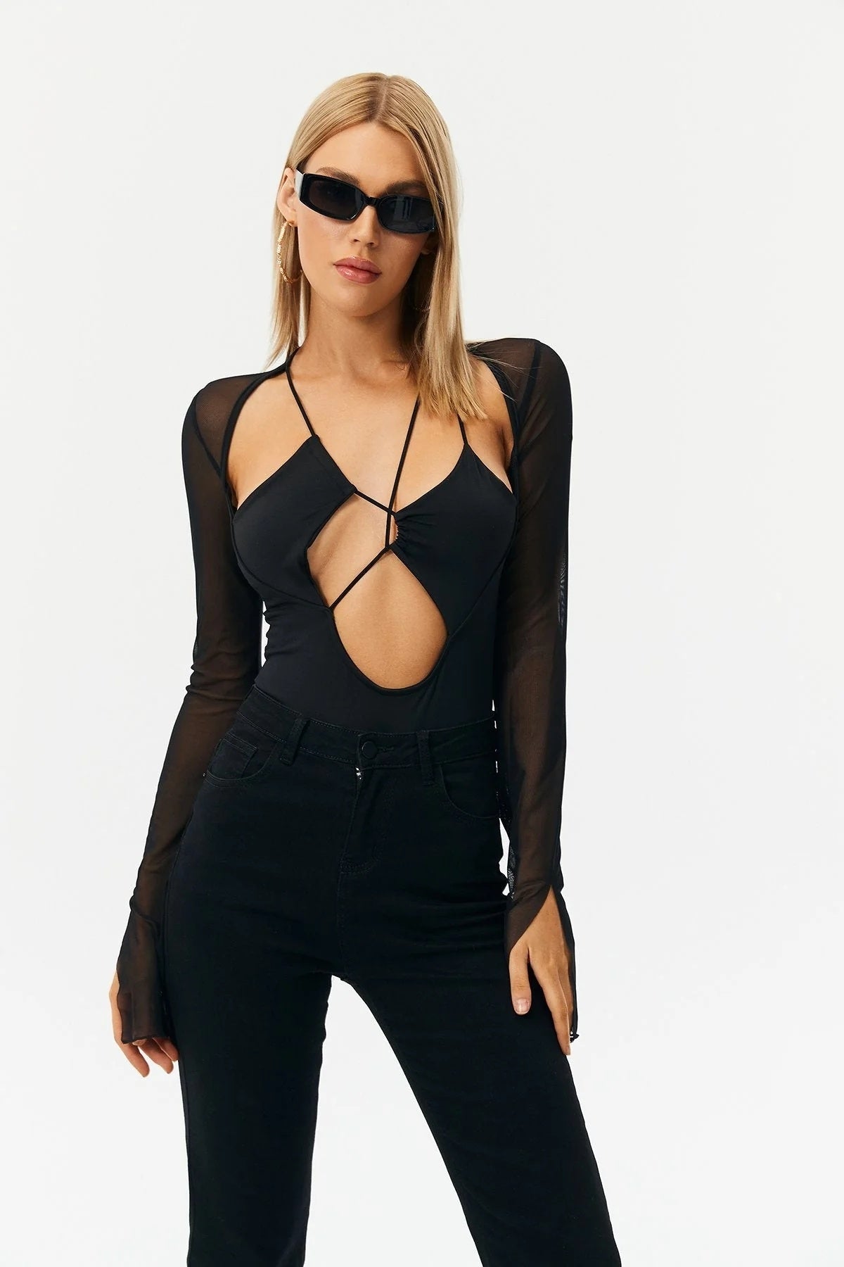2023 New Solid Color Long -sleeved Stitching Hollow Sexy Slim Body Top