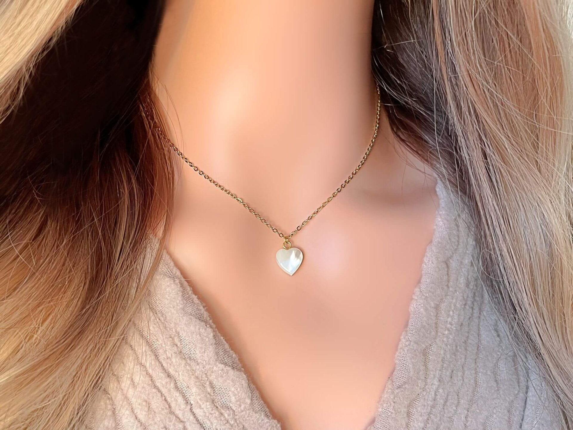 Dainty and minimalist seashell necklace with pendant made with natural sea shell carved in the shape of a heart.