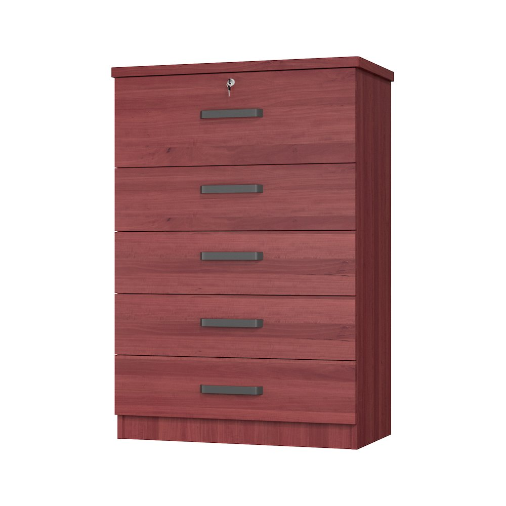 Give provincial a new meaning with the chic looks of the Xia 5 Drawer Chest of Drawers. Crafted from premium laminated engineered wood this durable five-drawer chest features thoughtfully designed larger top drawer with lock and 4 equal size drawers blow it. The fade and scratch resistant finish keeps this piece fresh while the black plastic handles add an industrial touch.