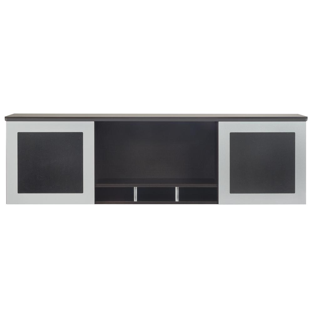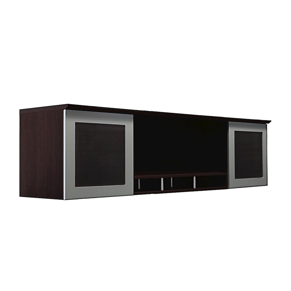 Frosted glass doors with silver frames Fully assembled Two open compartment slots Wall mounted or sits on corner supports