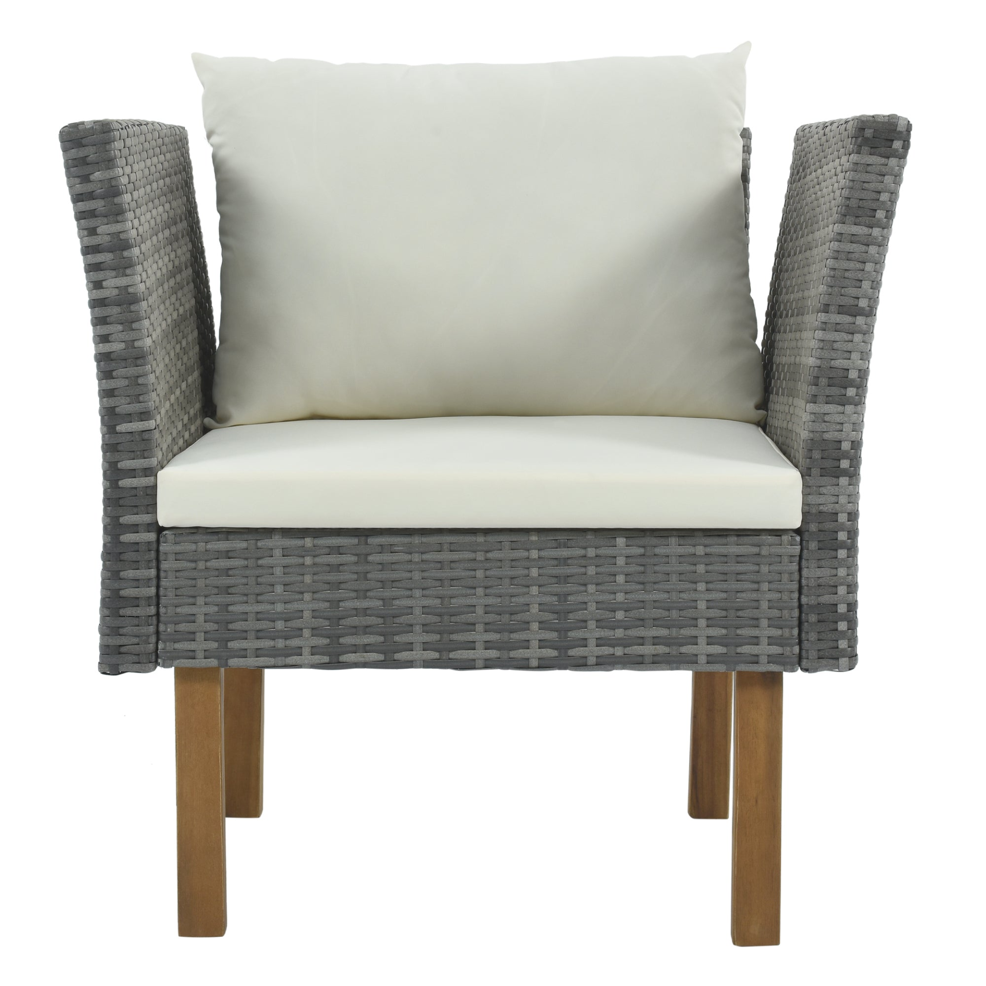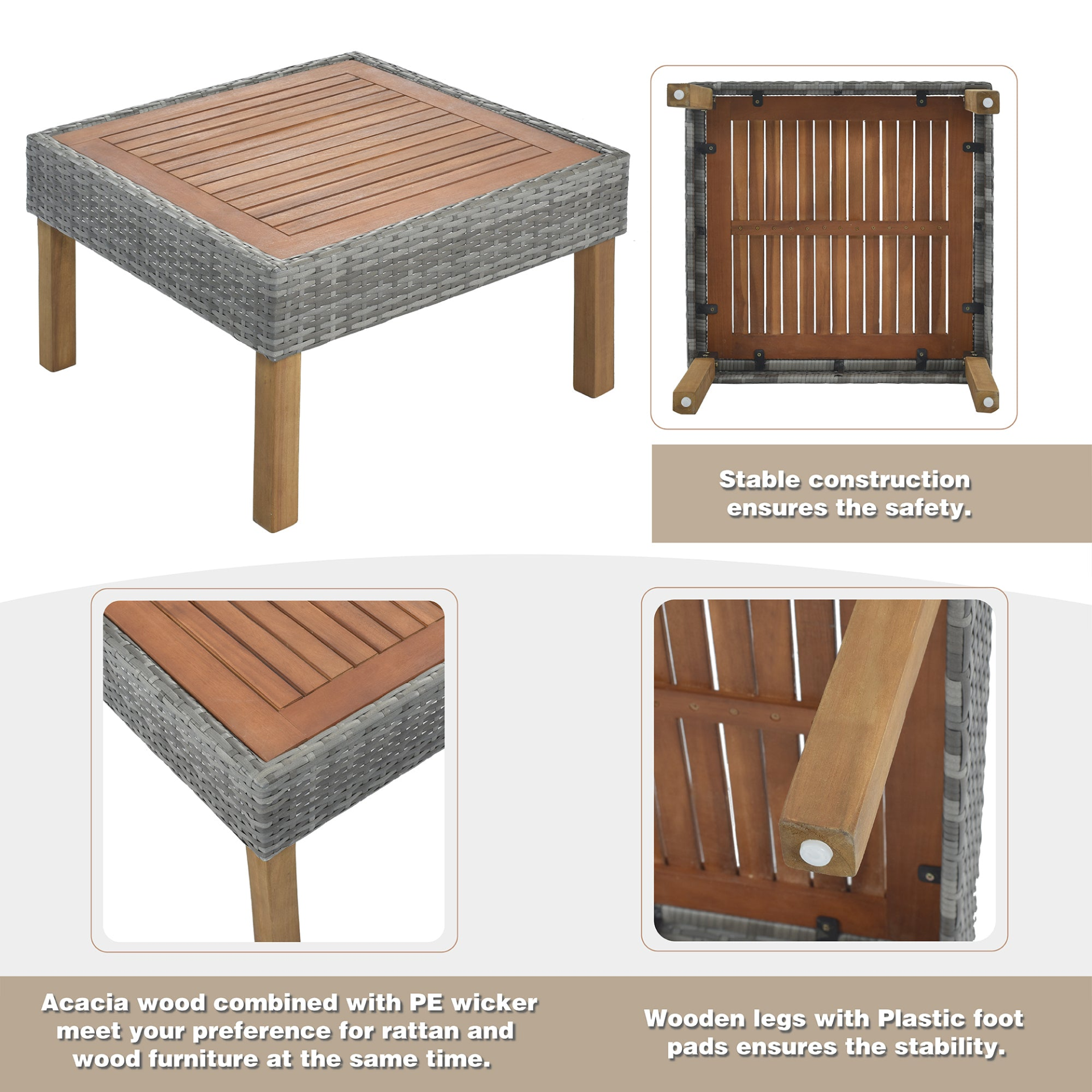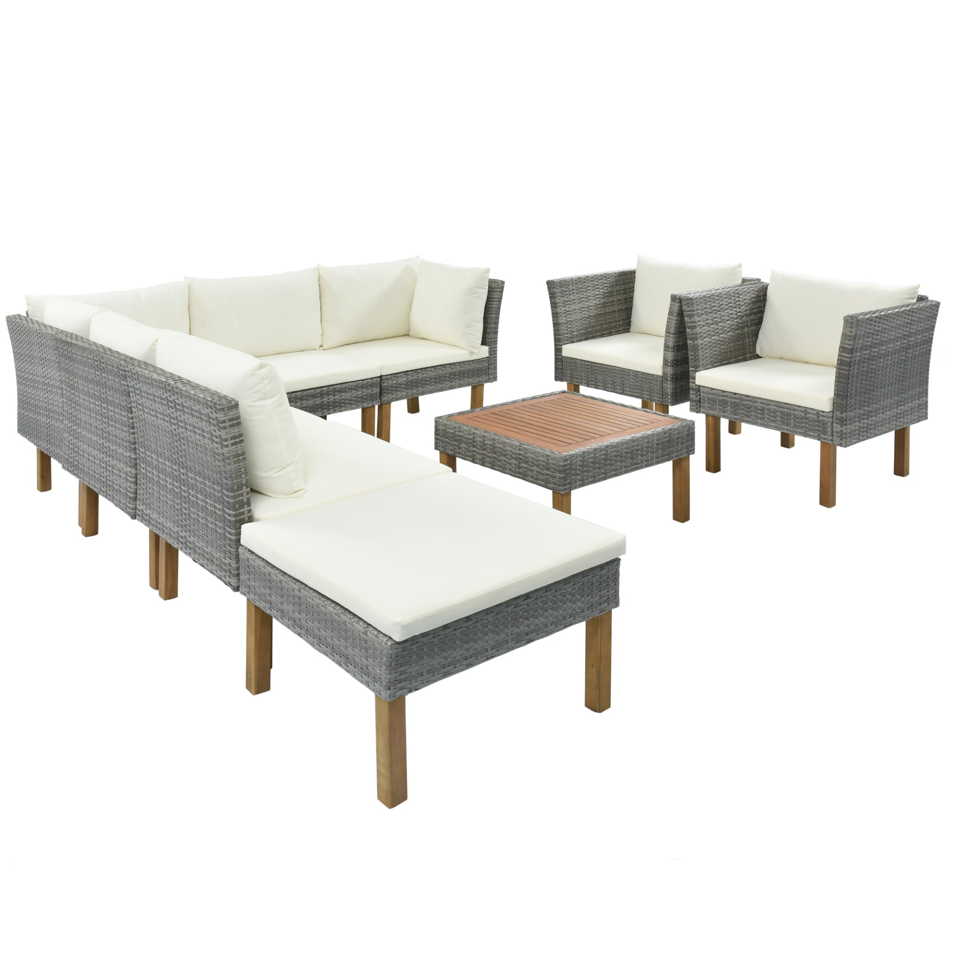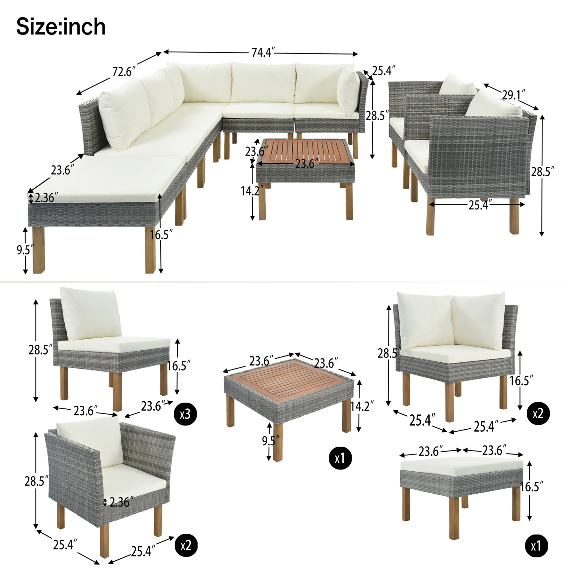 9-Piece Outdoor Patio Garden Wicker Sofa Set, Gray PE Rattan Sofa Set, with Wood Legs, Acacia Wood Tabletop, Armrest Chairs with Beige Cushions