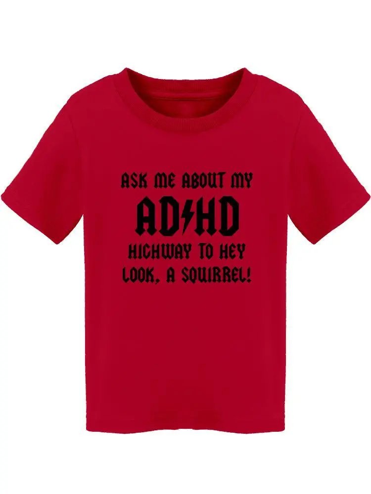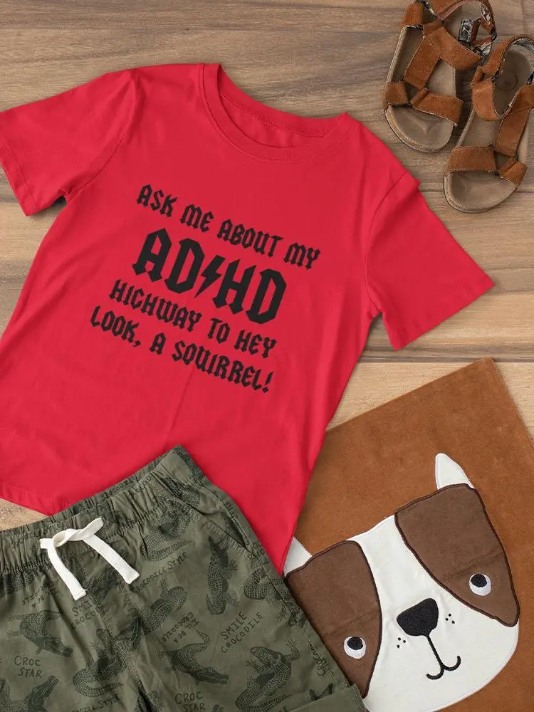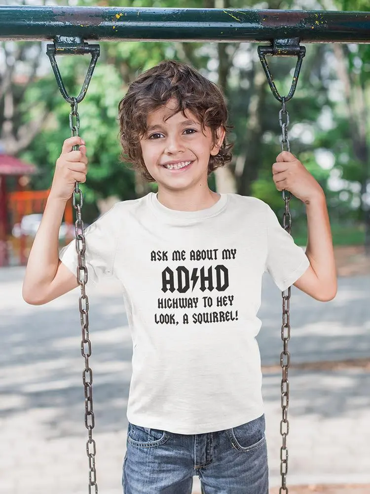 Funny quote design "Ask me about my ADHD, highway to...hey look a squirrel!". Toddler's White T-shirt