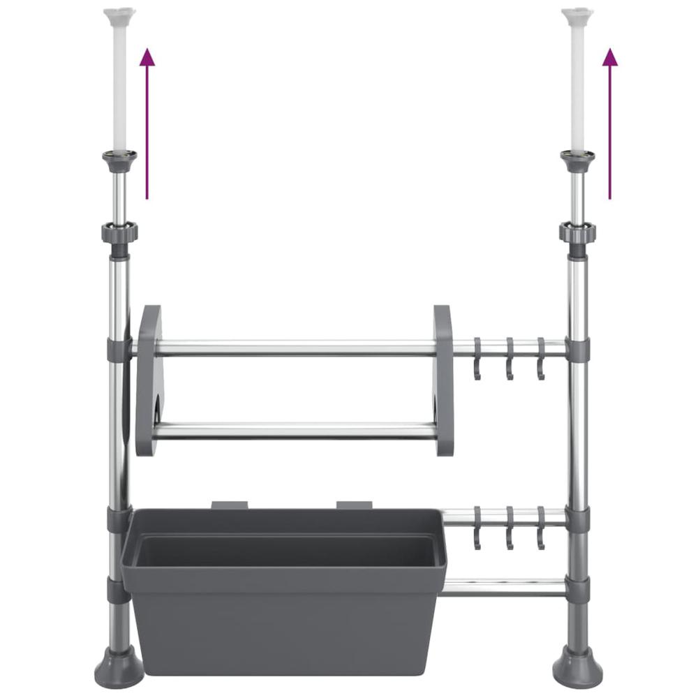 This trendy kitchen organizer is an ideal choice for families with limited storage space in the kitchen. Sturdy frame: The aluminum frame of this cleaning supplies holder ensures sturdiness and stability.Space-saving design: This tidy organizer with adjustable height can be simply clamped between worktop and top cabinet, providing extra storage space for your kitchen.Ample storage space: The cleaning supplies storage offers a kitchen roll holder, several hooks for brushes, cloths, etc. and a large basket for cleaning utensils.