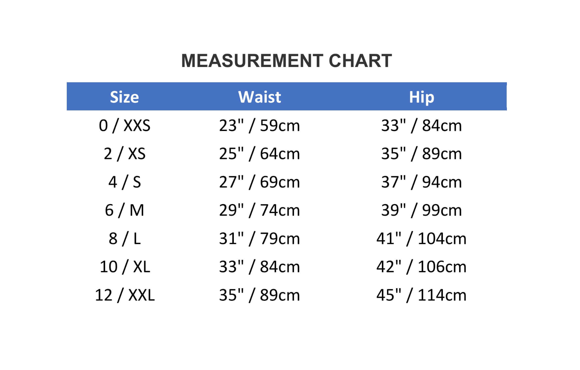 | 12 / XXL | 35" / 89cm | 45" / 114cm |