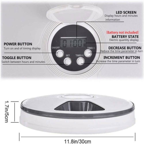 Automatic cat feeder has 6 food compartments will serve up to 6 meals a day. Set feeding times in 1-hour and 1-minute increments.The food tray and the base are linked by three horizontal snaps. Rotating the food tray clockwise can catch 2 parts, and rotating counterclockwise can separate 2 parts.