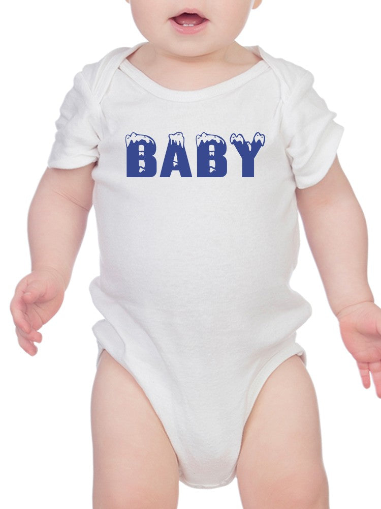Baby Text With Snow On The Top, For Your Baby! Baby's White Bodysuit. Design by Smartprints.