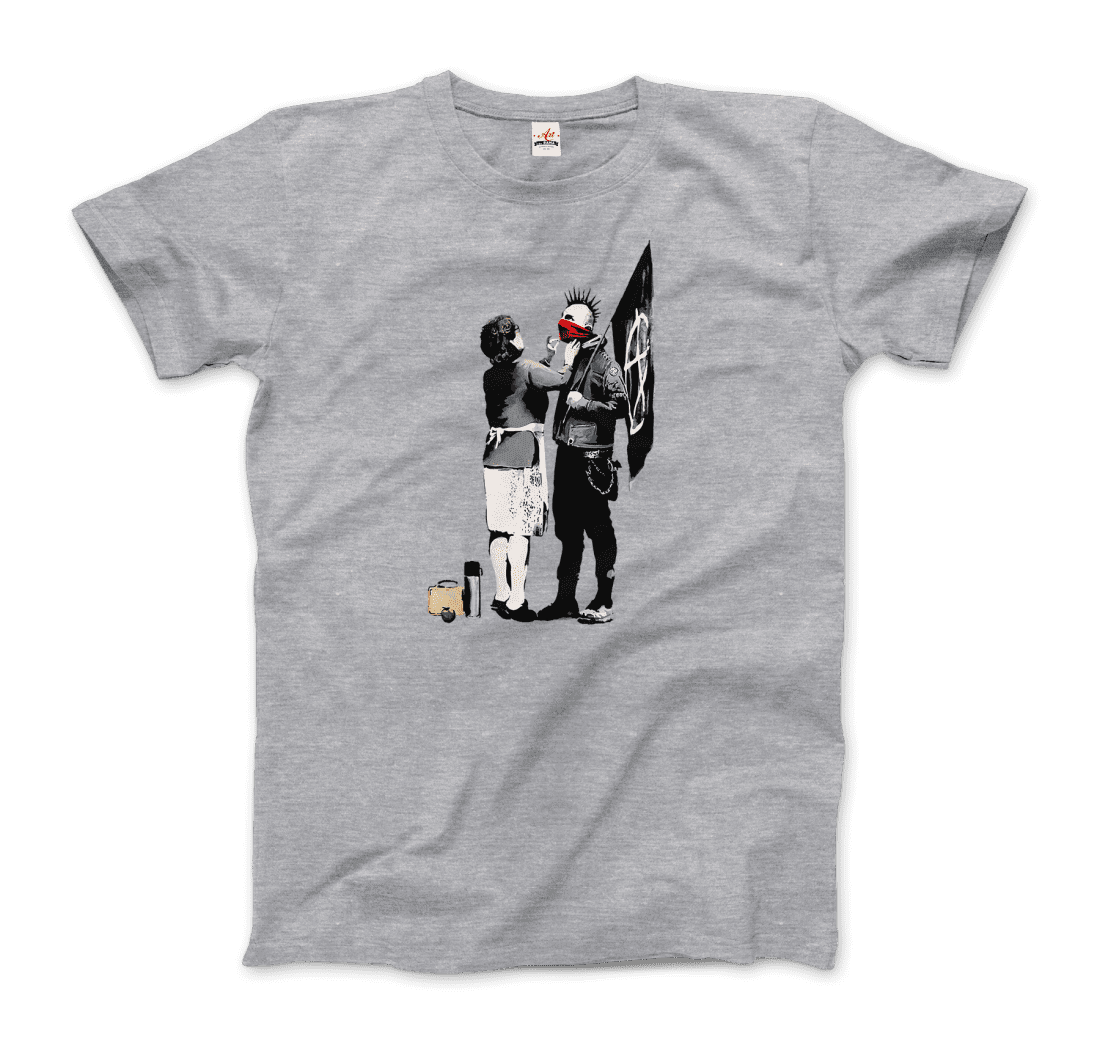 This marvelous tee features a mother preparing her son, a punk, to go fight for what he wants. Banksy's satirical street art and subversive epigrams combine dark humor with graffiti executed in a distinctive stenciling technique and his works of political and social commentary have been featured on streets, walls, and bridges of cities throughout the world.