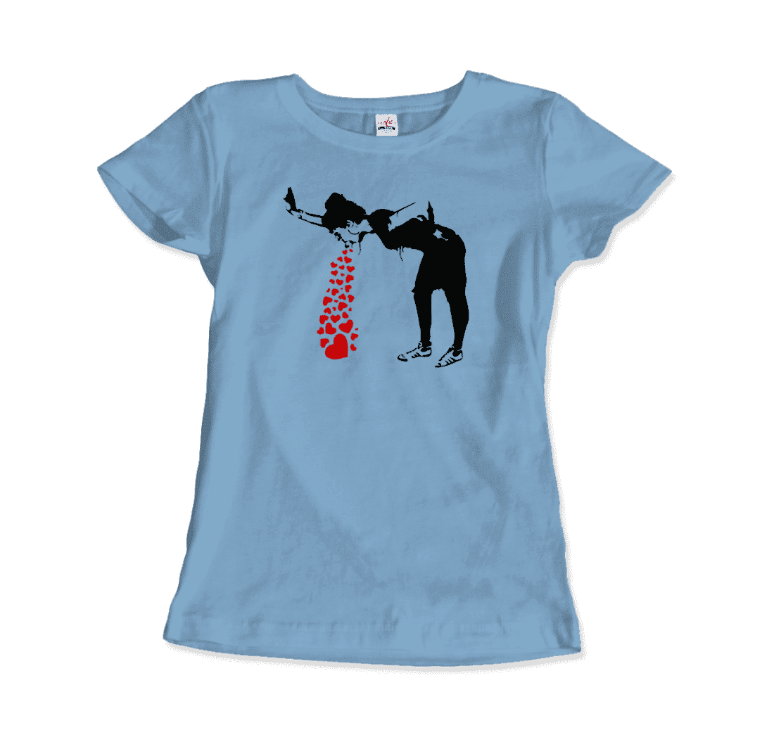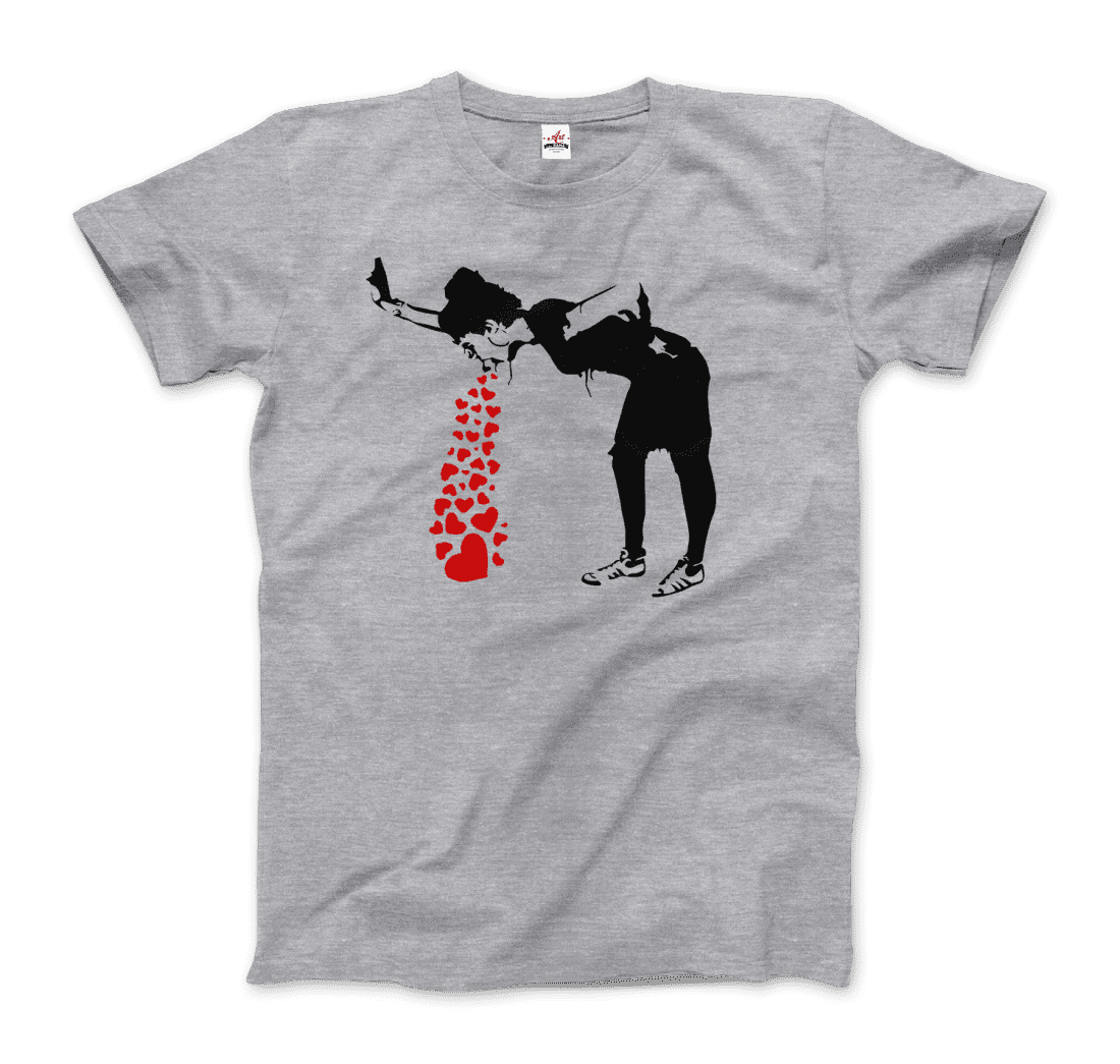This amazing tee features a woman vomiting hearts. Banksy's satirical street art and subversive epigrams combine dark humor with graffiti executed in a distinctive stenciling technique and his works of political and social commentary have been featured on streets, walls, and bridges of cities throughout the world.