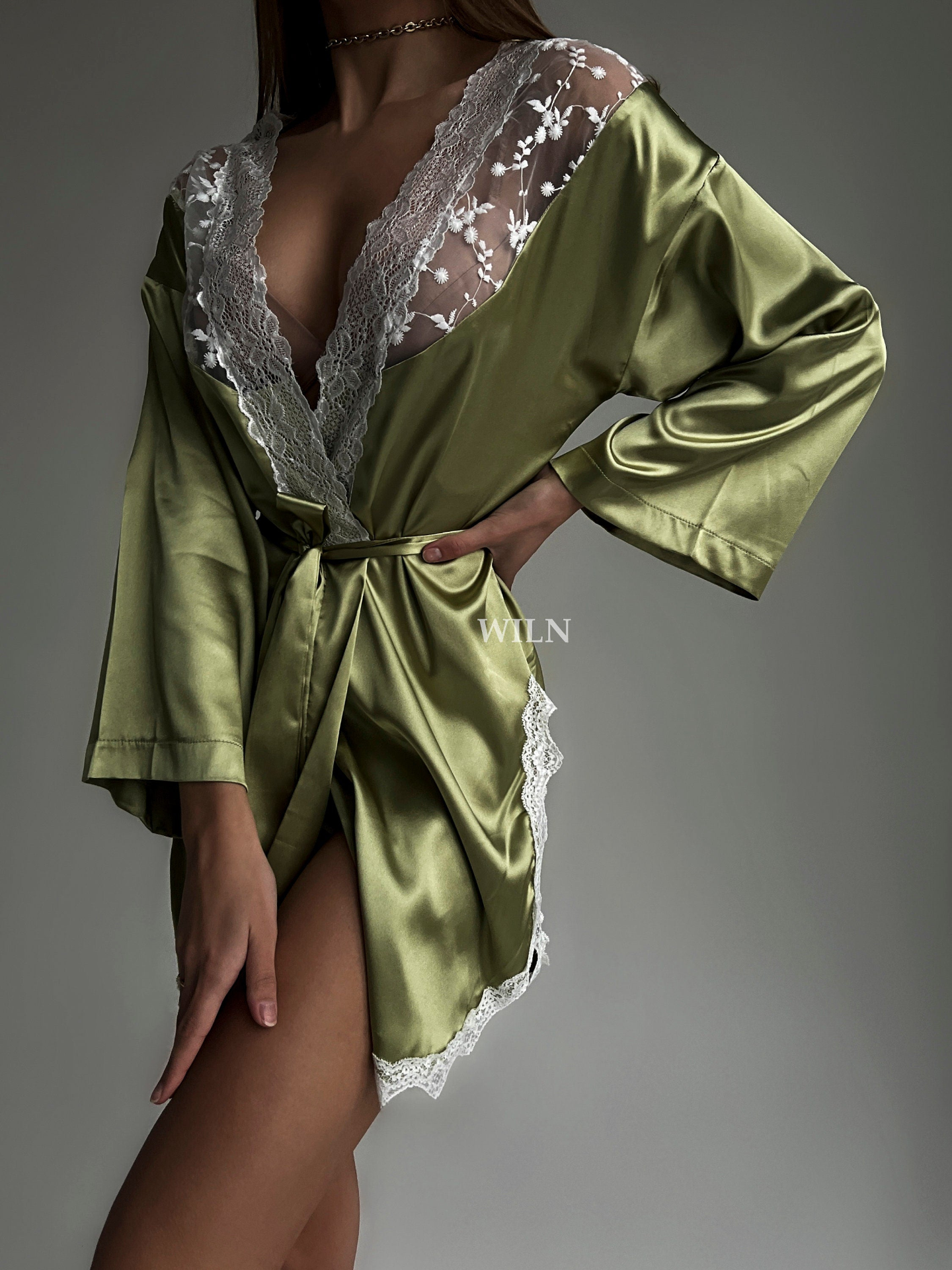 Channel your inner royal in this sumptuous bridal Robe in green satin. The elegant flowy long sleeves of the kimono will make you feel like a goddess! It doesn't get much more luxurious - or bridal - than that. Celebrate your wedding day or any other day with this getting-ready dressing gown that'll always remind you of your special day.