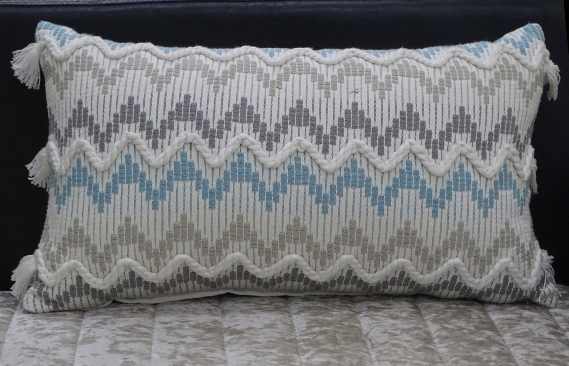 14x20 in handwovn chevron pillow with briad and tassels. 100% Cotton. Includes: 1 Decorative Pillow with high quality insert. Added Corner Tassels. Back of the pillow has solid color with no pattern. Spot Clean only. Designed in USA. Zipper Closure for easy removal of insert. Indoor Use Only