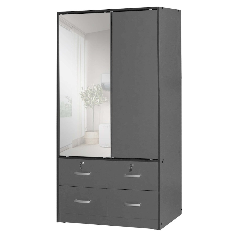 Bring the iconic energy of contemporary yet modern style to your bedroom or living room with the WPFurniture Sarah Double Sliding Door Armoire with Mirror. Crafted with durable engineered wood for reliable support, this wardrobe comes with a splayed frame, clean edges, linear design, fade proof lamination, two sliding doors with a sturdy crossbar for hanging shirts, coats, pants, and jackets, upper shelf space, and four storage drawers for to organize smaller items. The perfect complement to your bedroom decor, organize your clothing today with the Sarah wardrobe cabinet. Assembly required.
