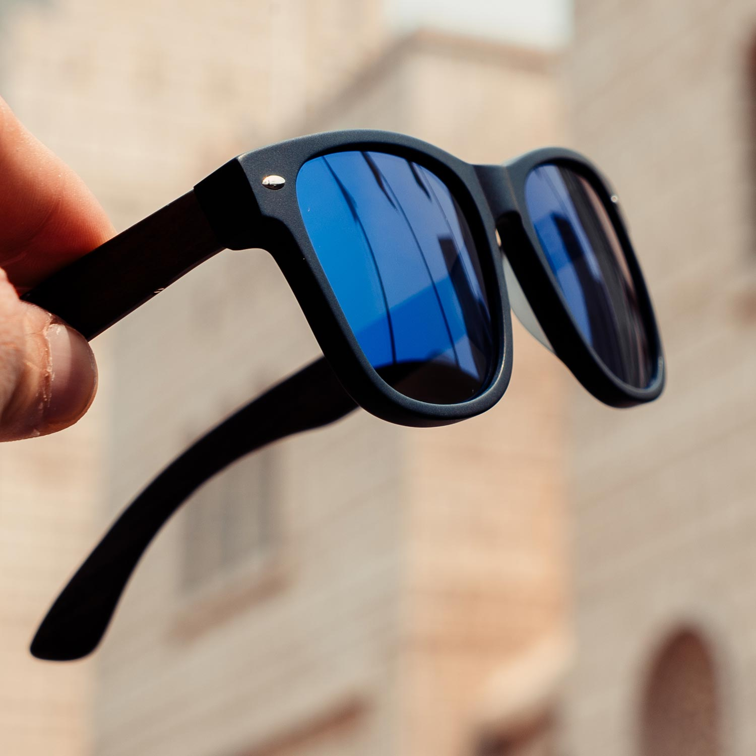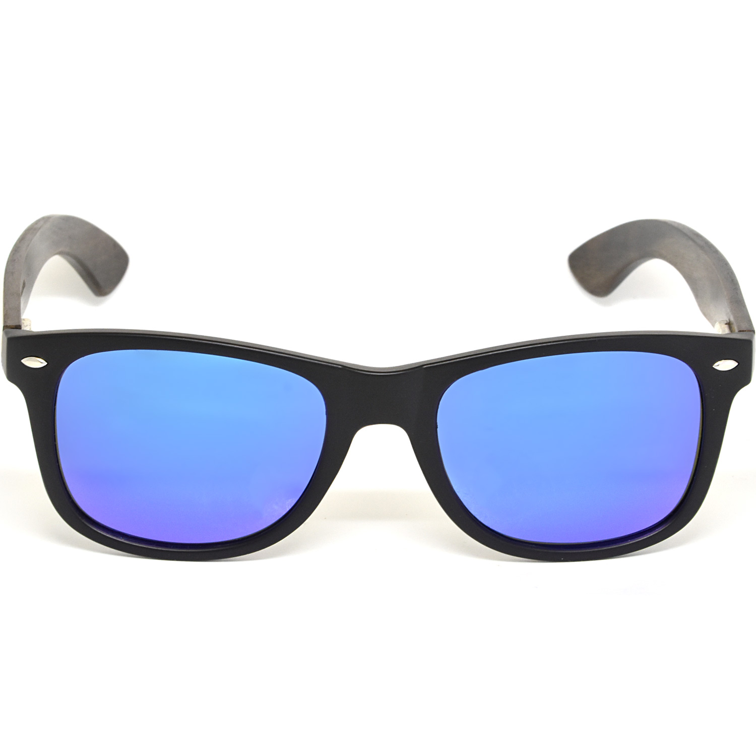 Ebony wood classic style sunglasses with matte black acetate front frame and blue mirrored polarized lenses