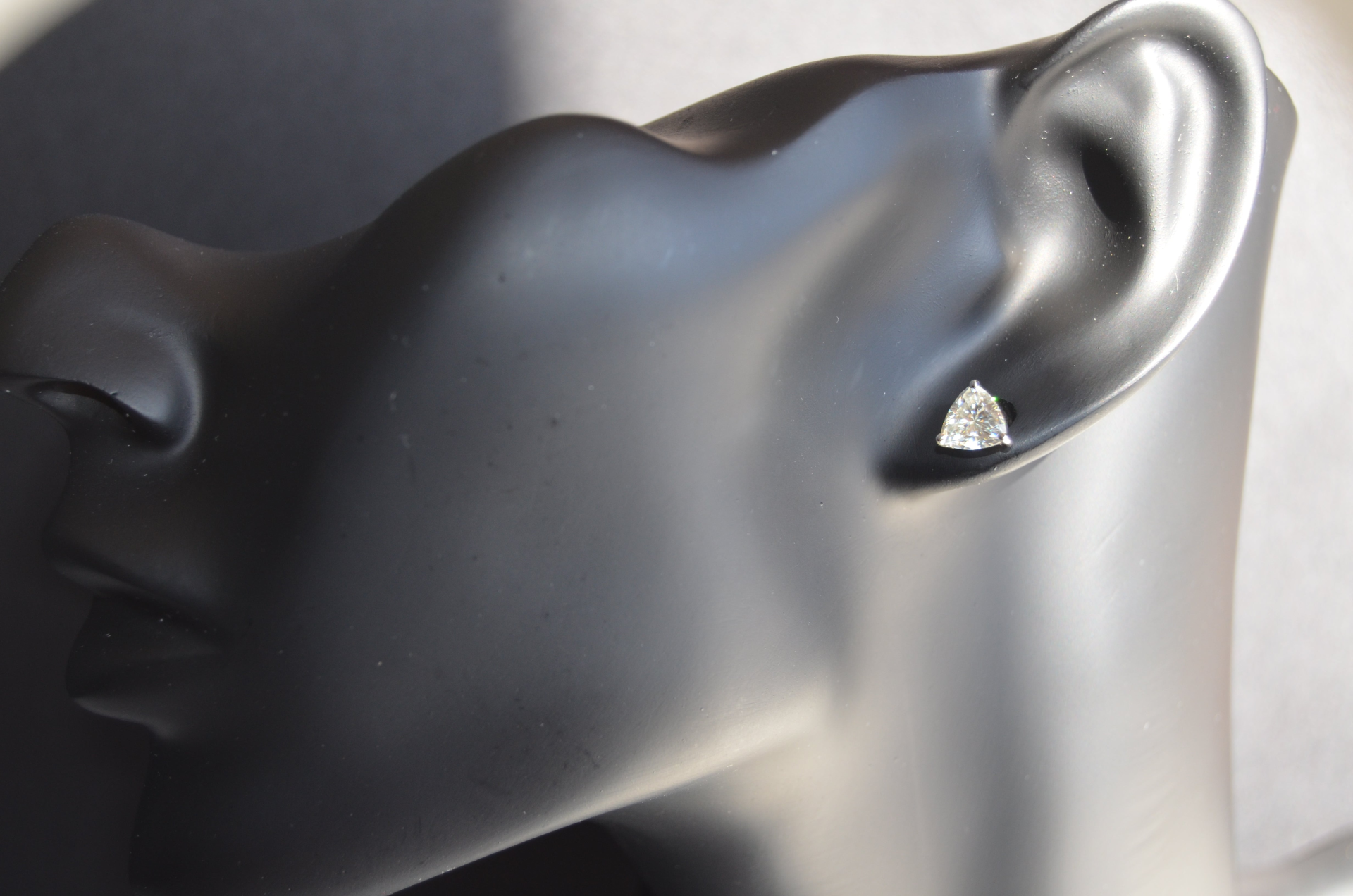 Experience timeless beauty with these Elegant Trillion-Cut Moissanite Earrings. Each earring features a mesmerizing Moissanite stone measuring 4.5mm and weighing 0.54 carats, set in luxurious 14kt white gold. The unique trillion cut of the Moissanite stones creates a stunning display of light, while the white gold setting adds durability and sophistication to the earrings. Perfect for special occasions or everyday wear, these earrings are an essential piece for any jewelry collection. Gift them to yourself or someone special to add a touch of elegance to any outfit. Push Back Clouser and it comes in a beautiful box packeging.