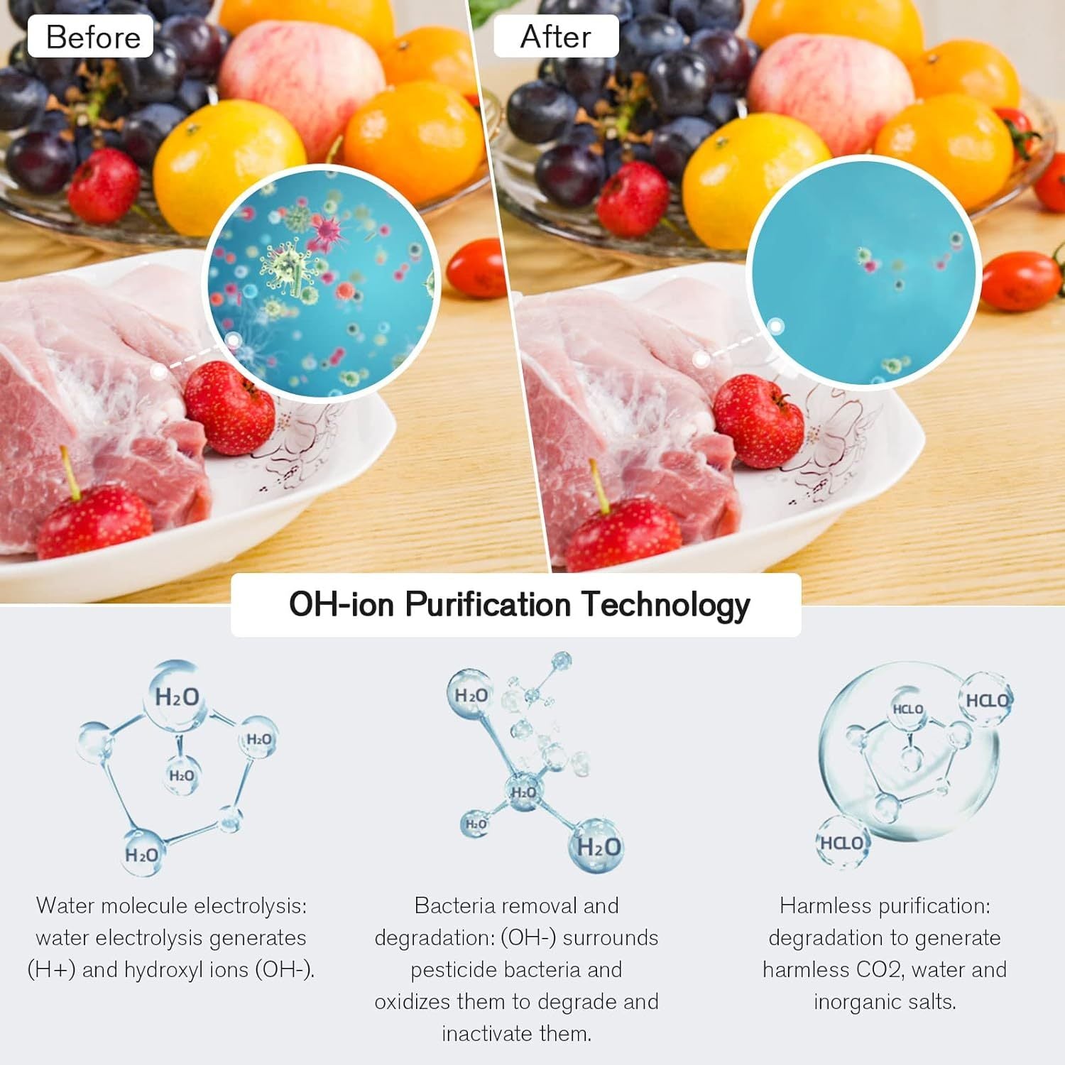 - 【OH-ion Purification Technology】Fruit purifier adopts high-energy OH-ion purification technology, using water as raw material, quickly degrades harmful substances into harmless substances. No chemical addition. No damage to food nutrition. OH-ion can penetrate deep into the crevices, thoroughly clean and remove 99% of the residual harmful ingredients.