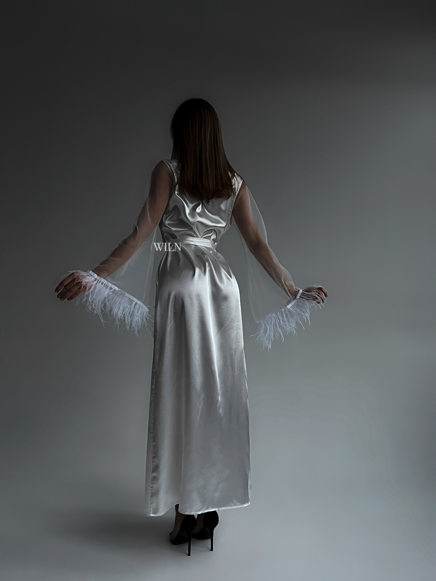 Channel your inner royal in this sumptuous bridal Robe in white satin. The elegant flowy long sleeves of the kimono will make you feel like a goddess! It doesn't get much more luxurious - or bridal - than that. Celebrate your wedding day or any other day with this getting-ready dressing gown that'll always remind you of your special day.