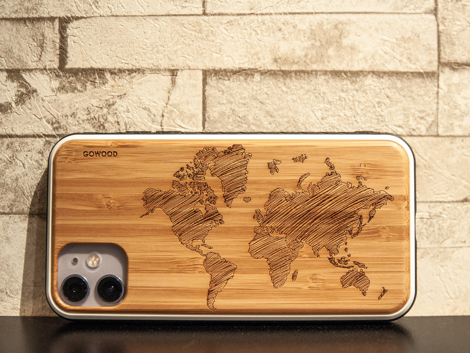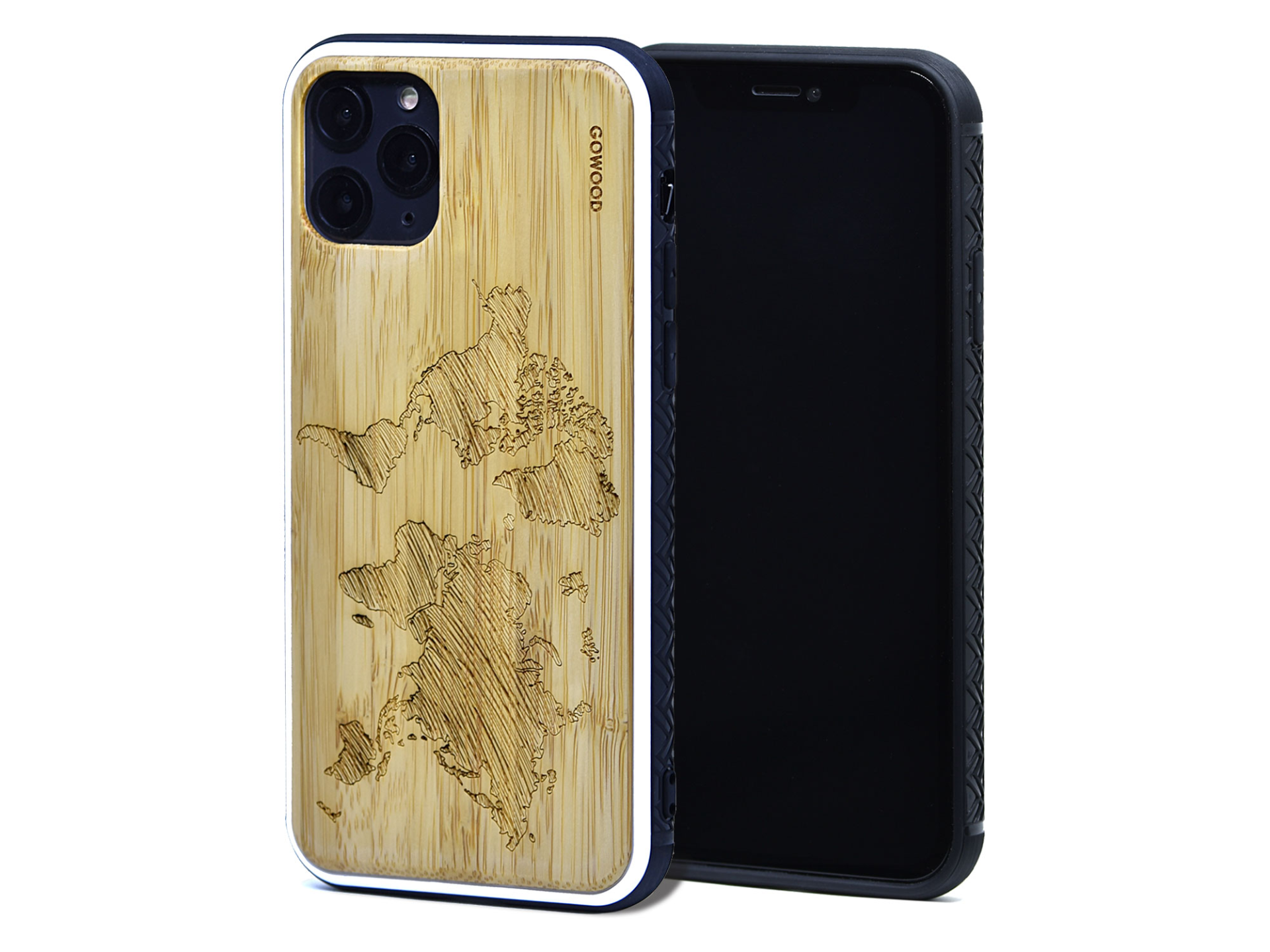 iPhone 11 Pro wood case world map engraved bamboo backside with TPU bumper