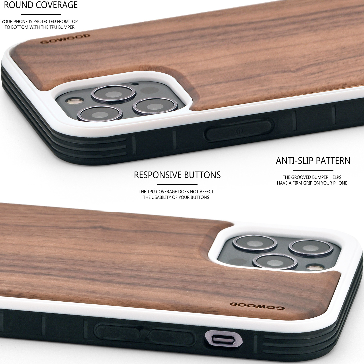 iPhone 12 and iPhone 12 Pro wood case with shock absorbing anti-slip TPU bumper, real walnut wood backside with white polycarbonate layer inside