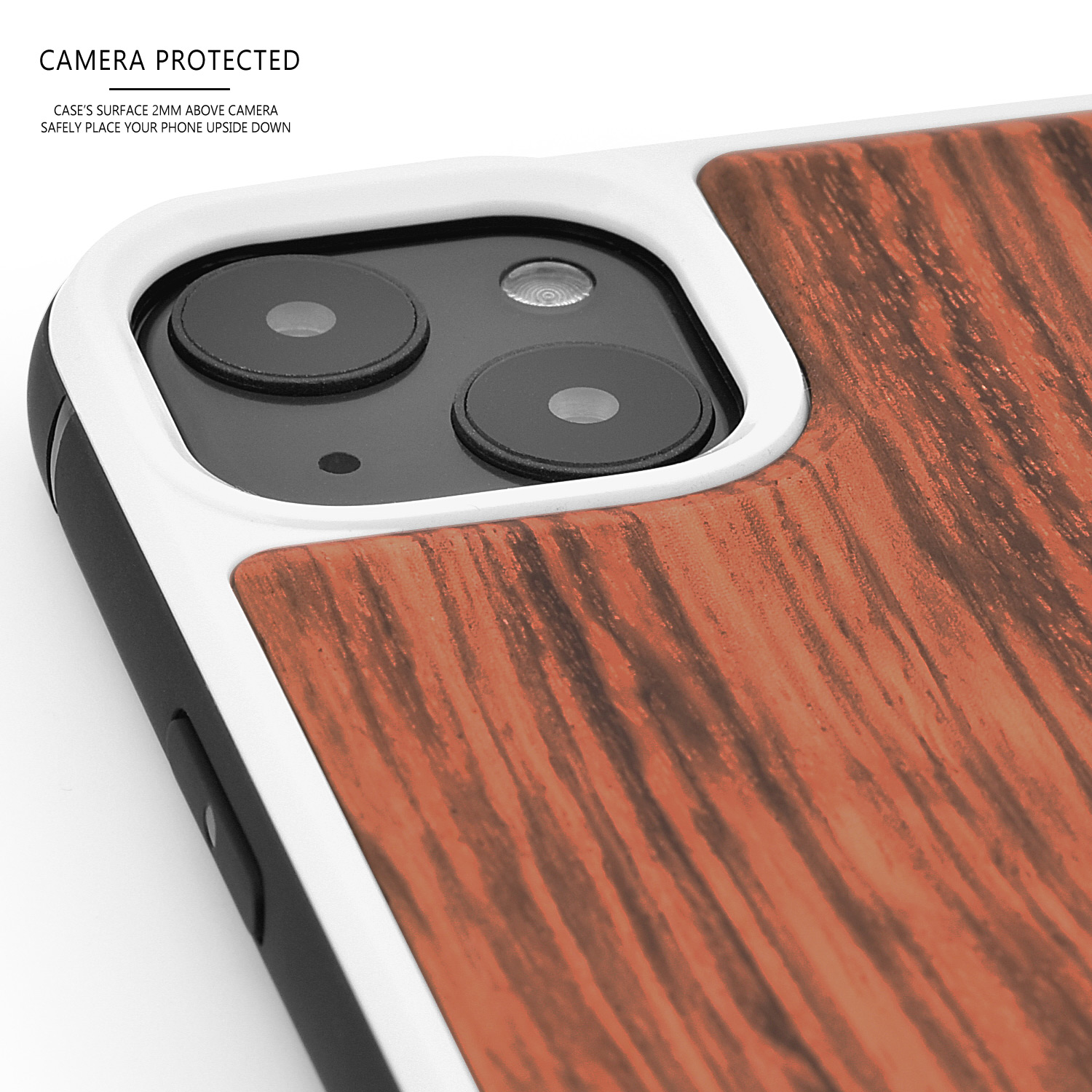 iPhone 13 Mini zebra wood case with shock absorbing anti-slip TPU bumper, real zebra wood backside with white polycarbonate layer inside