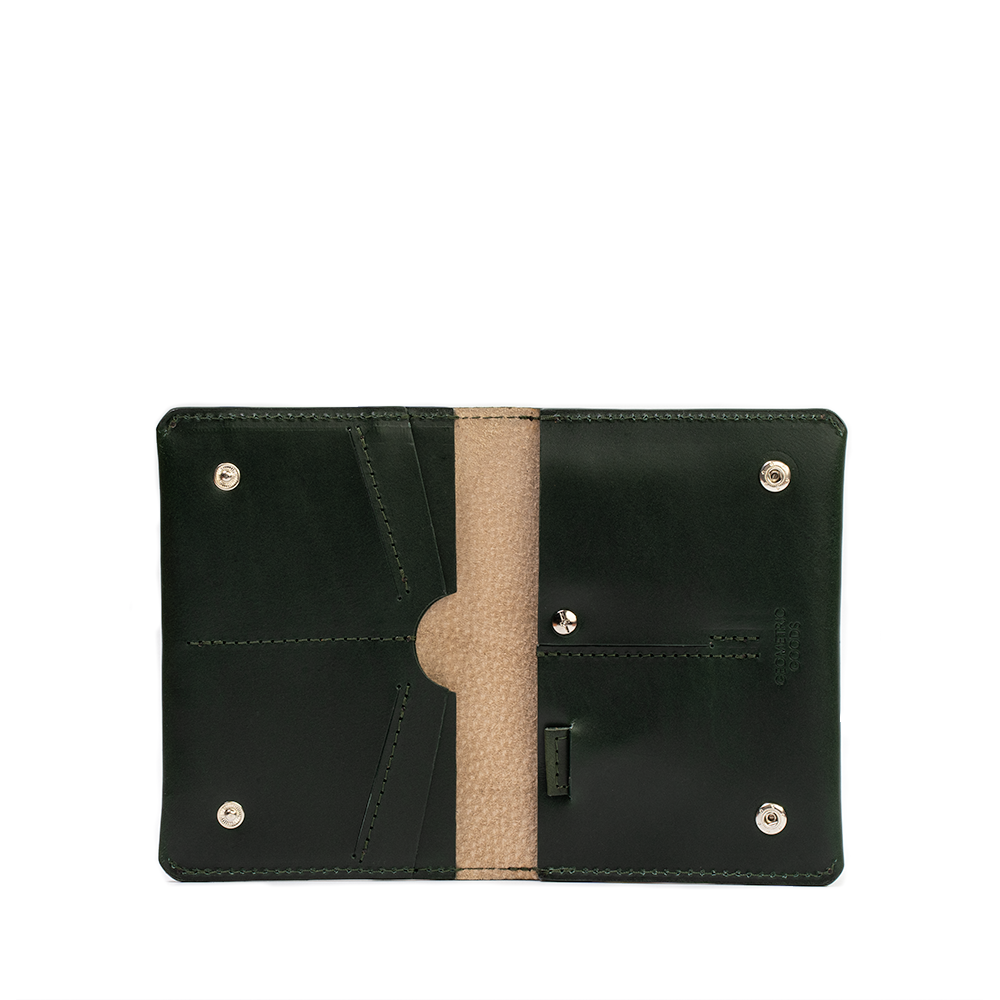 Holds up to 11 cards, US dollar or Euro bills, passport, and your AirTag. Closes on snap buttons.