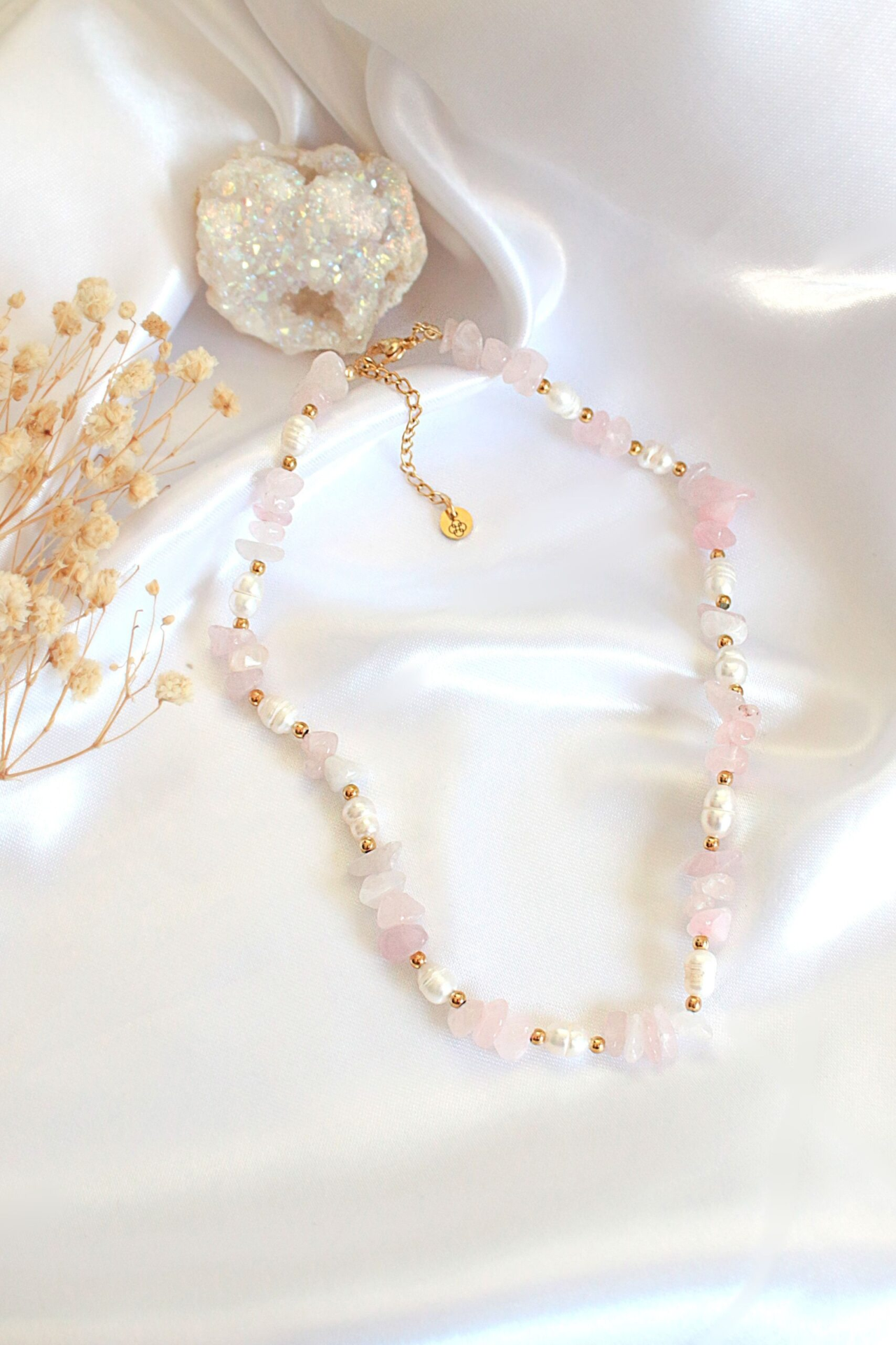 This rose quartz choker is the perfect combination of elegance without neglecting natural crystals with spiritual healing powers.