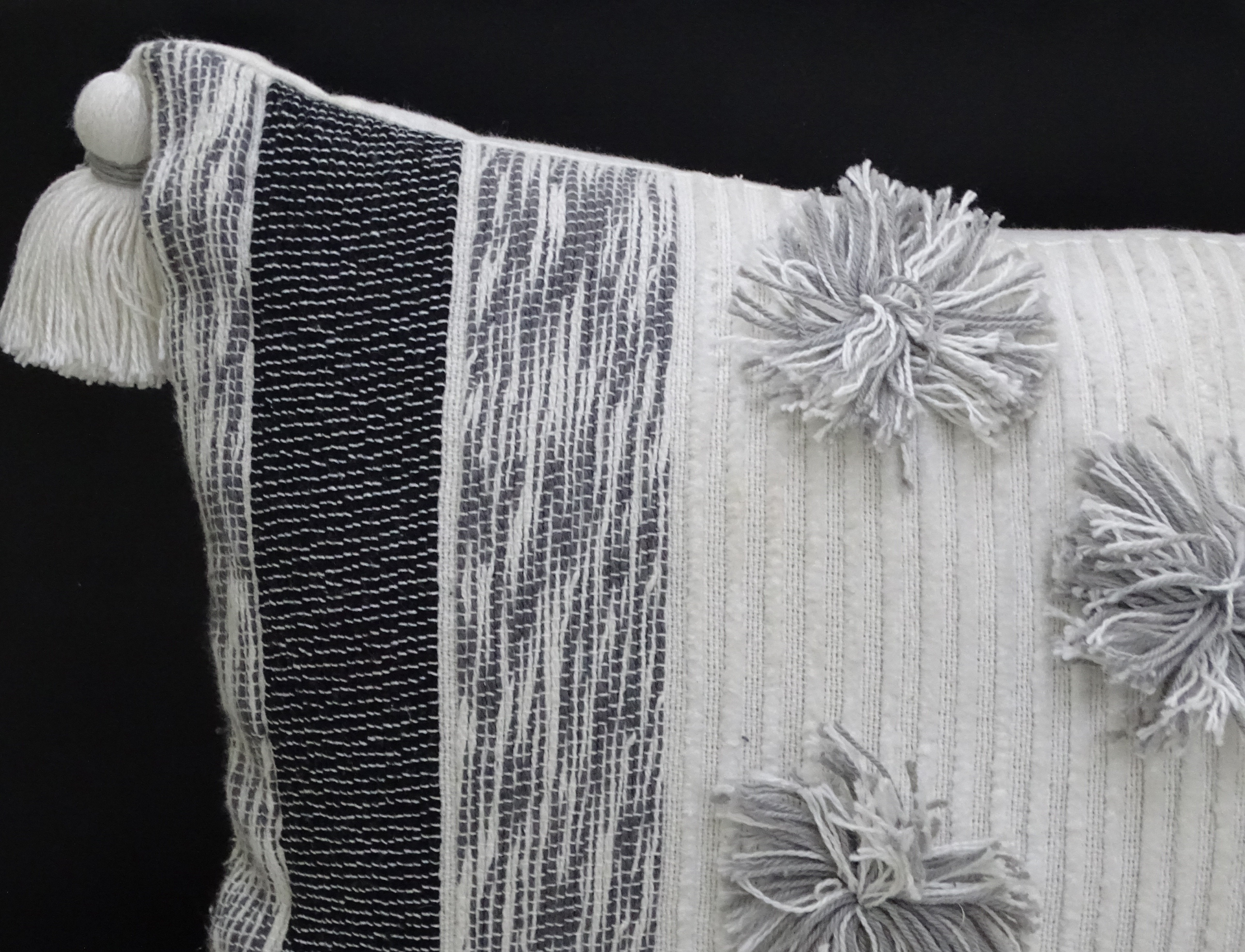 14x24 handwoven melange striped pillow with large pom-poms and tassels