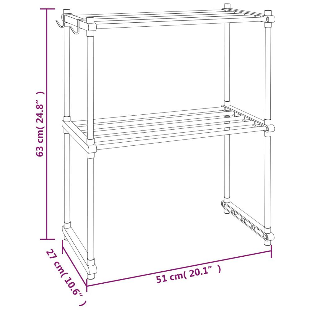 Give your countertop room to grow with this microwave shelf that creates valuable vertical storage. Sturdy frame: The aluminum frame of this microwave stand ensures sturdiness and stability.Ample storage space: The microwave rack with 2 shelves offers ample space for kitchen items well-organized and makes your kitchen neater.Practical hooks: The removable hooks on the side are handy for oven gloves, kitchen utensils or hand towels.Wide application: The microwave shelf stand is suitable for use in the cupboard, pantry, cabinet, closet, table, desk, countertop, under the sink, etc.