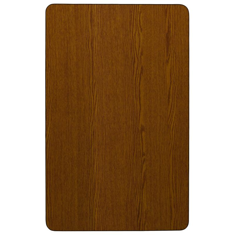 Popular Rectangular Activity Table Scratch and Stain Resistant Surface 1.25" Thick High Pressure Oak Laminate Top Black Edge Band 16 Gauge Tubular Steel Legs Black Powder Coated Upper Legs and Chrome Lower Legs Legs Adjust in 1" Increments Locking Casters Recommended Grade Level: 1st Grade - Adult Recommended Seating Capacity: 8 Adults; 10 Children