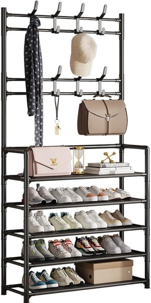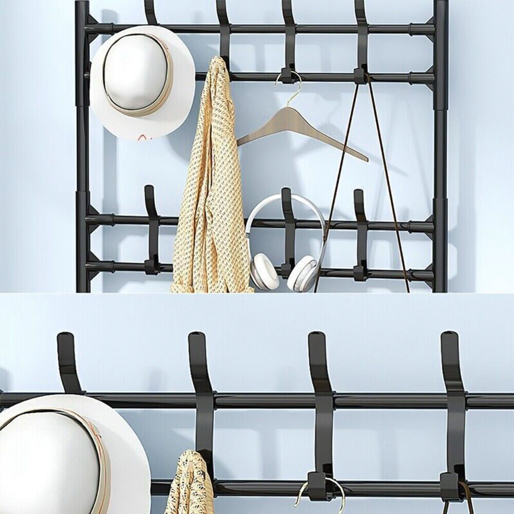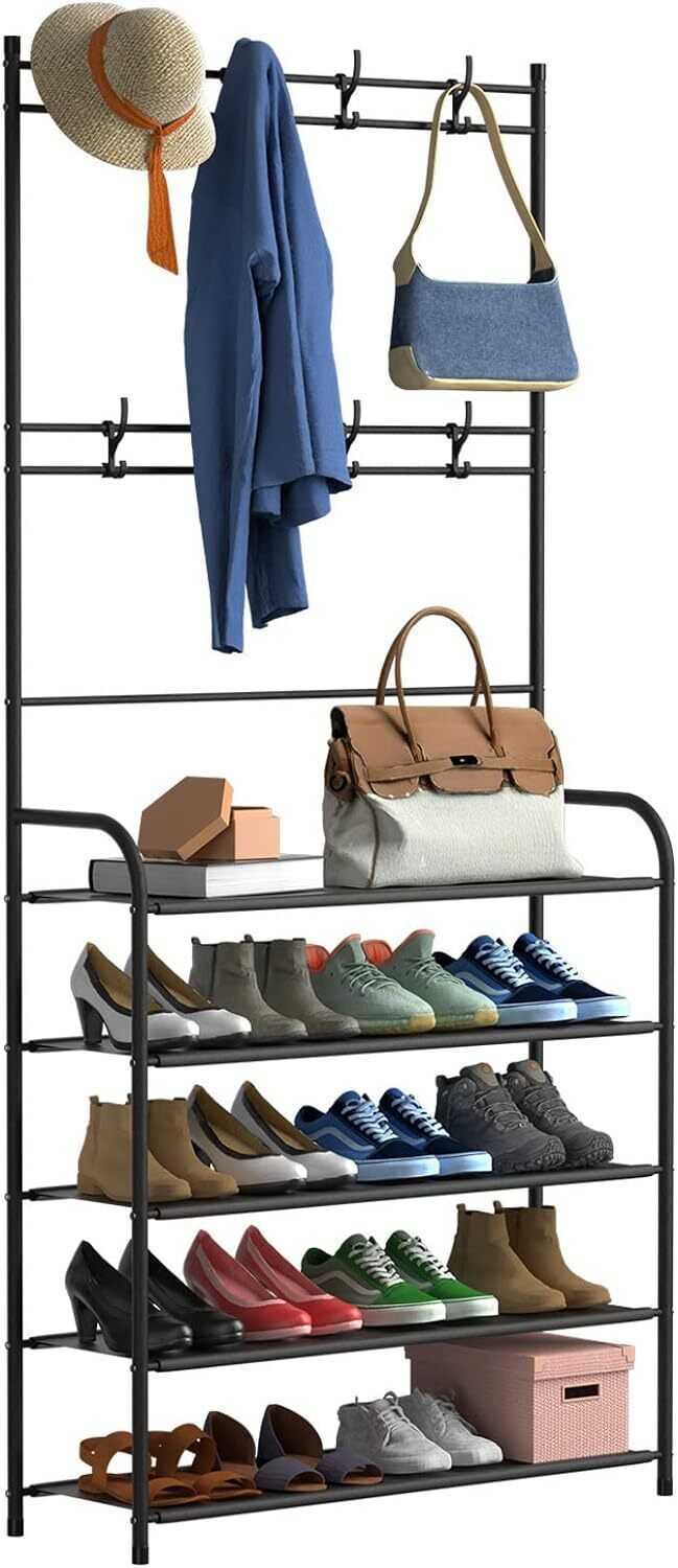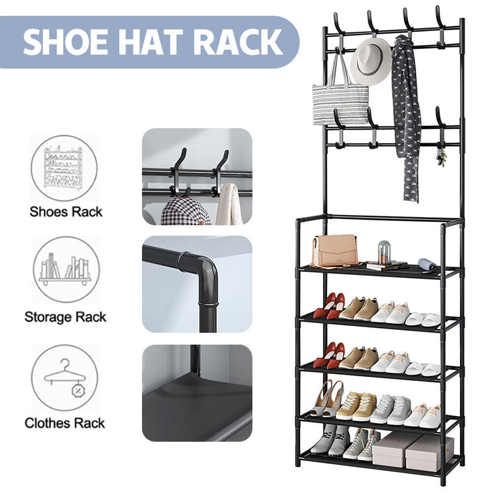 New Coat And Hat Stand 8 Hooks Metal Shoe Rack 5 Tiers Shelf Hanger Black