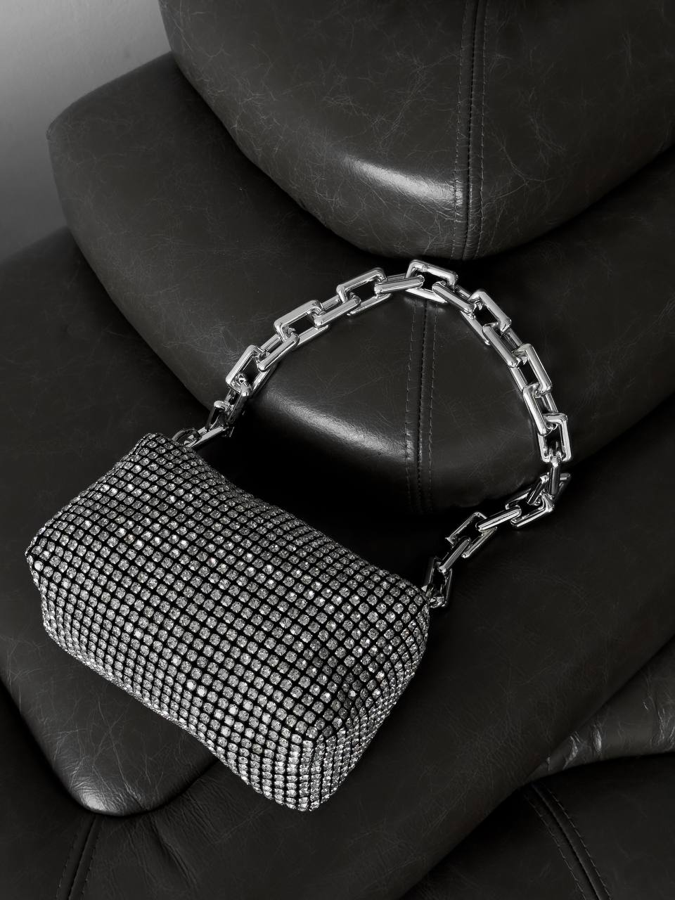 The ultimate sparkle bag inspired by starry nights! SPARK is a stylish medium-size bucket handbag. Hand-crafted in high-quality rhinestone crystals, it completes an elegant yet chic look that will turn heads and make you the party star. The shiny handbag comes with a detachable silver chain strap, allowing you to wear it hands-free or as a clutch. 100% vegan and cruelty-free.