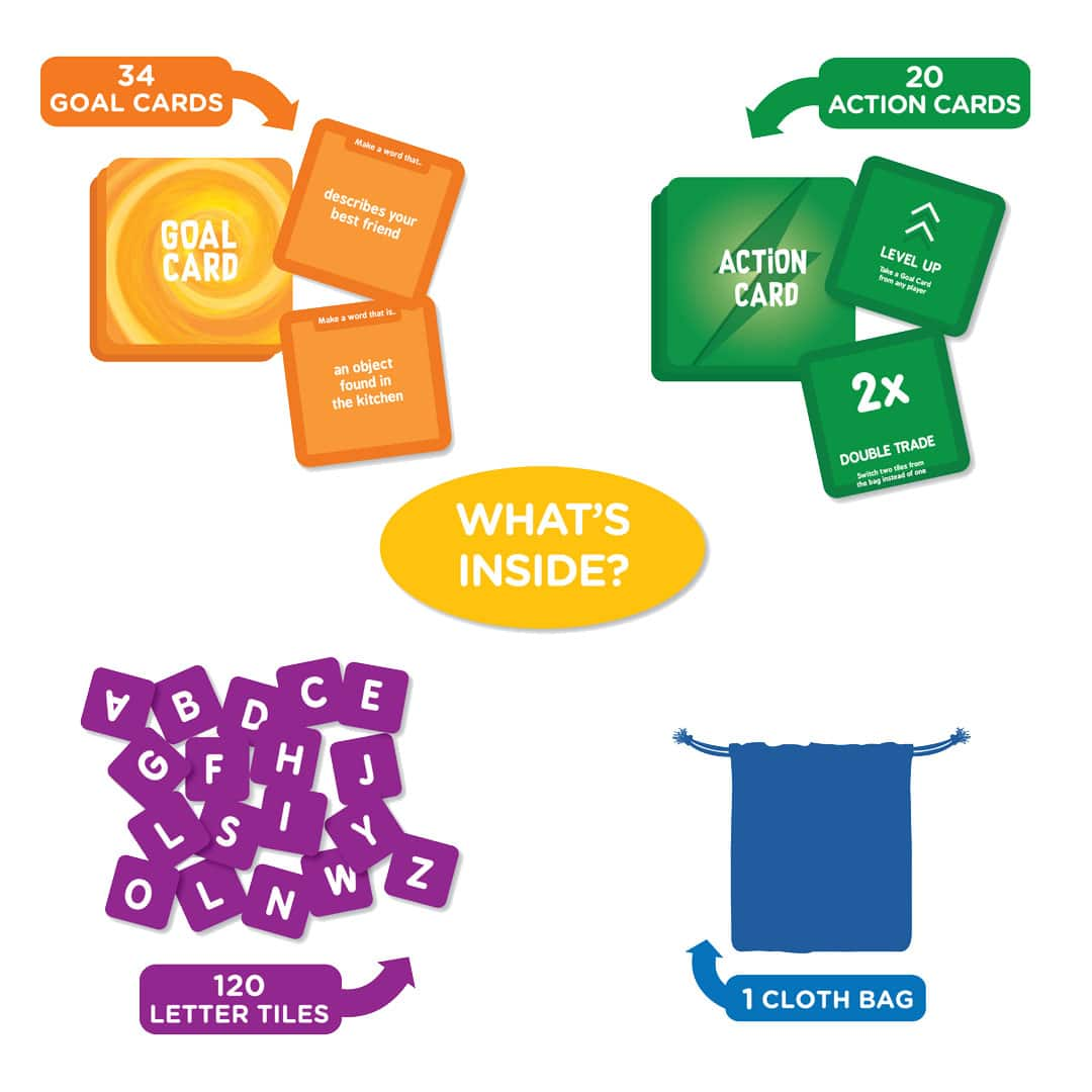 The box contains 34 goal cards which state the criteria that needs to be fulfilled by the players. The player that makes a word which fulfils the criteria earns the Goal Card. The player to earn five goal cards wins the game!