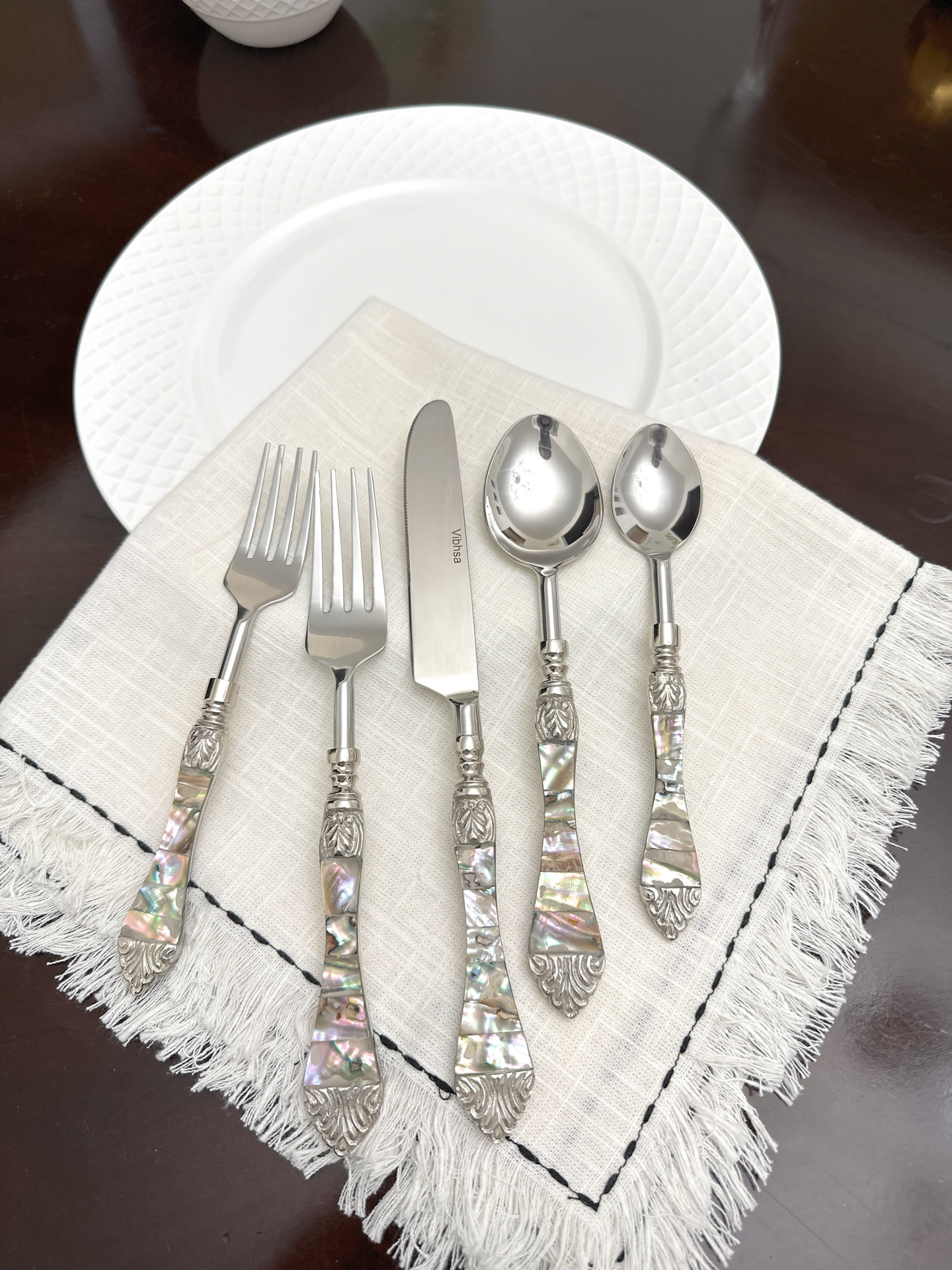 Create a stunning coastal-inspired table setting with this 20-piece Flatware set featuring intricate seashell and wave designs on the handles. Crafted from high-grade stainless steel, the set offers outstanding durability, corrosion resistance, and a lasting shine. The carefully calibrated weight and balance of each piece gives you effortless control and a comfortable grip. Complete with all essential utensils for a full dining experience. Perfect for ocean-inspired gatherings!