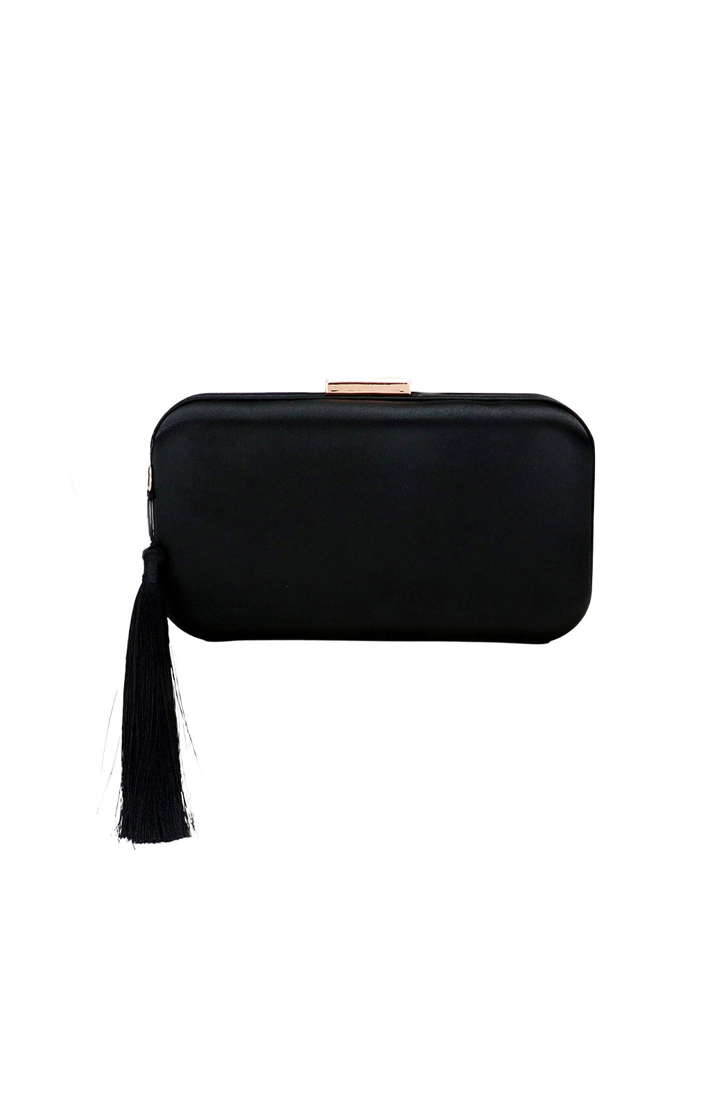 This elegant Tassel Evening Clutch provides an effortlessly chic accent to any outfit. Crafted with a soft satin look fabric exterior, luxurious black fabric lining, a long full tassel, and a detachable gold cross body chain measuring 48" long, this stylish clutch is both fashionable and functional. A clasp closure also ensures maximum security of your contents.