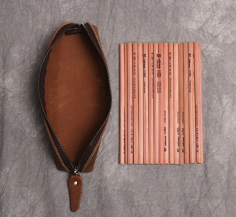 The Paavo Leather Pen Case is made of full grain leather and handmade with meticulous stitching and attention to detail. The Paavo is constructed with the utmost care using top-quality materials. It is the perfect case for protecting and transporting fountain pens, pencils, markers, makeup, or any other writing instrument. The Paavo pen case is made from the highest quality Full Grain Leather that will develop a beautiful patina and is finished with a brass YKK zipper. This pen case is handmade with quality and designed with practicality in mind. The Paavo Leather Pen Case | Leather Makeup Pouch offers plenty of space for your makeup or accessories and can be used when traveling, as well as at work or school. It's durable, lightweight, and made with full grain leather, so it will stand up to daily wear and tear. The Paavo is the perfect gift for anyone and is the perfect size for an everyday handbag accessory. It can be paired with a handcrafted leather tote bag for an extra special gift. Its handcrafted design is unmatched and guaranteed to last a lifetime