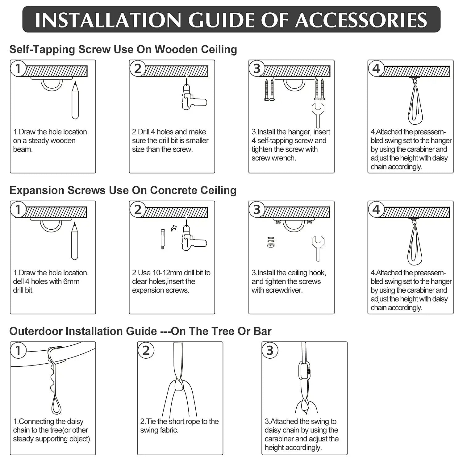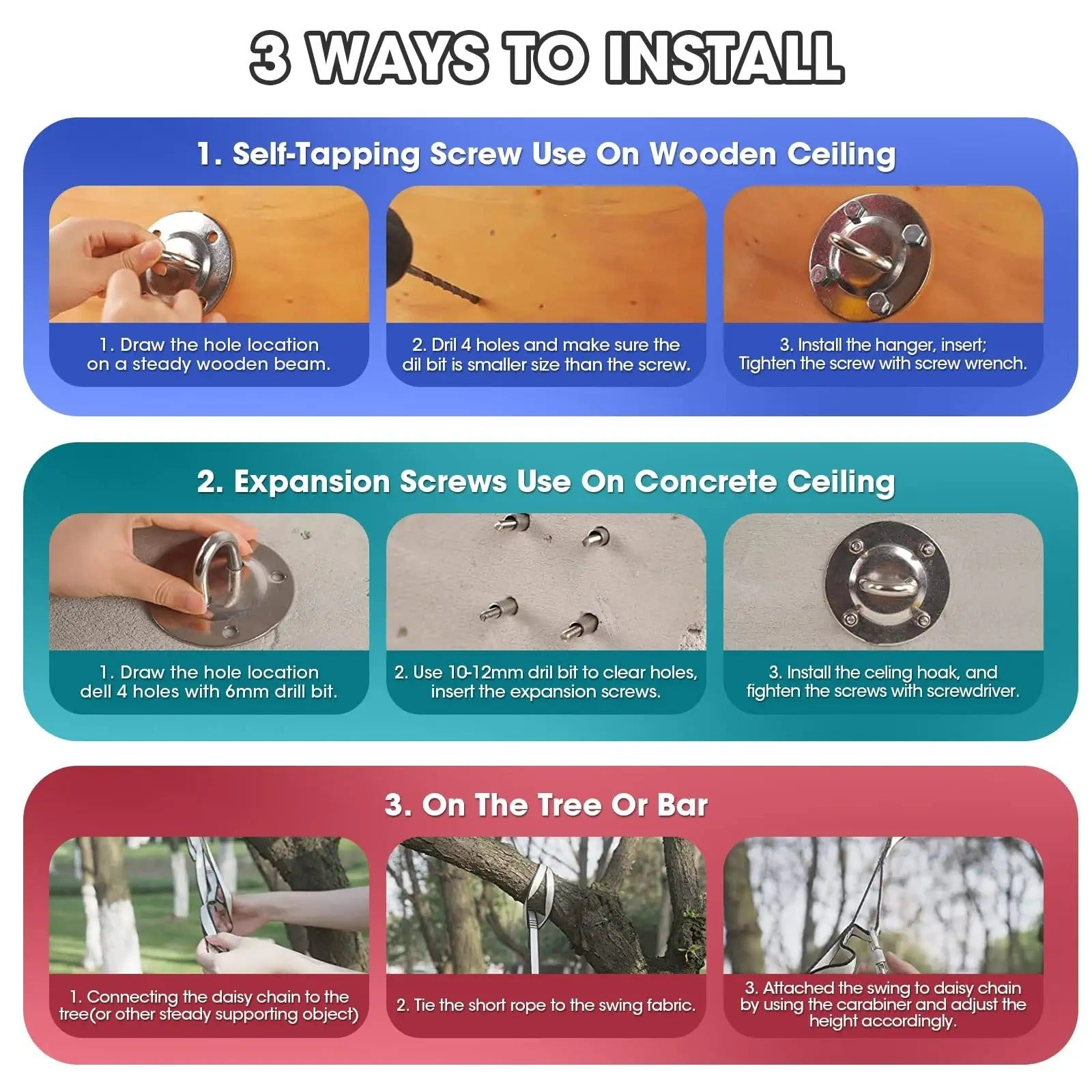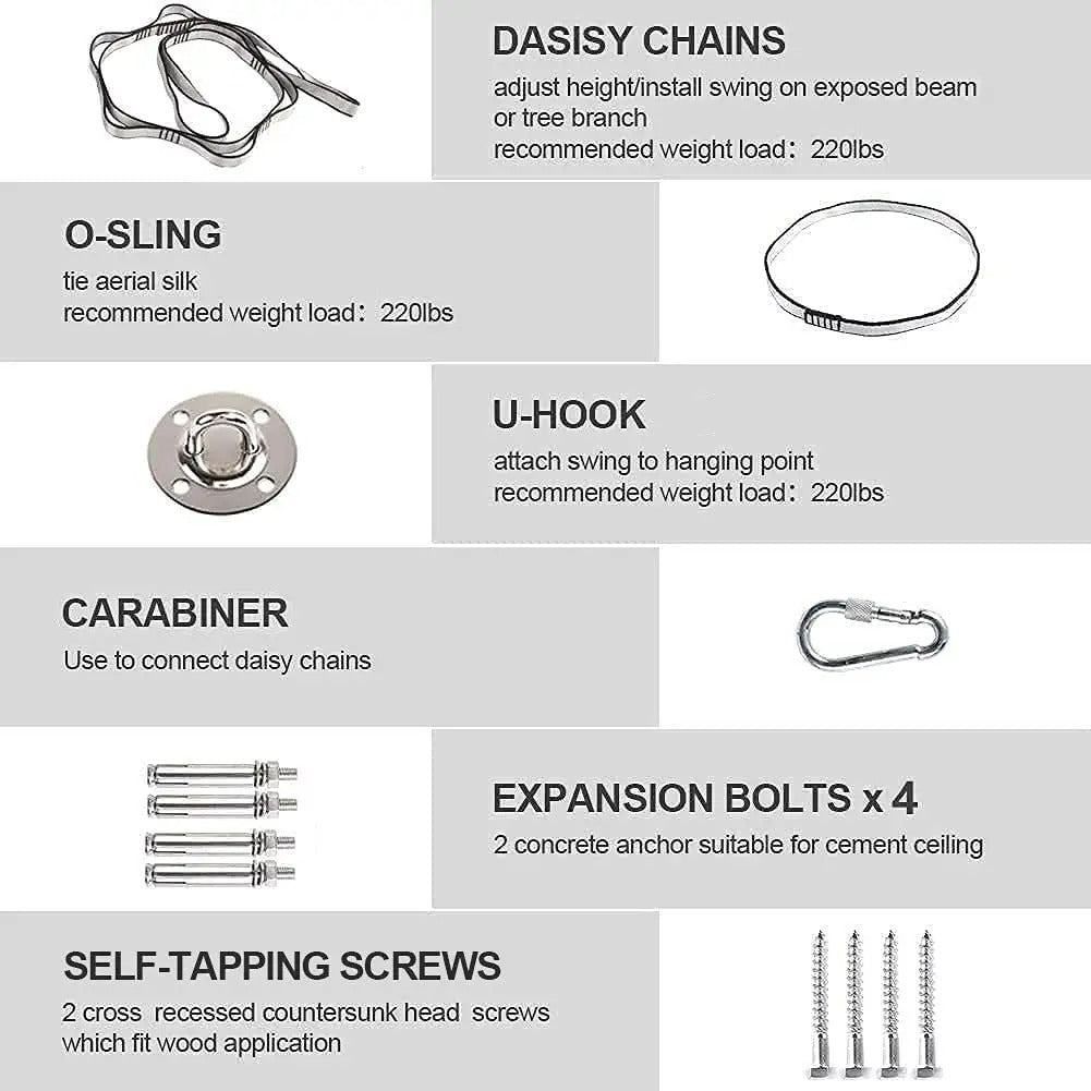 - [EASY USE]: No need to purchase extra hardware or figure out complicated pieces. This yoga swing is sent with necessary hardware. The whole swing can be set up within few minutes indoor/outdoor.The daisy chain can adjust the height easily--make hanging simple for kids.(Age: 3~10. Young children should use it under supervision and with help of adults)