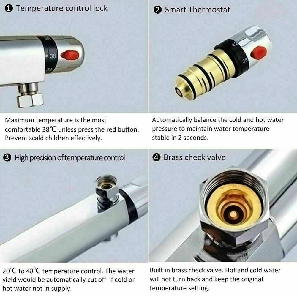 Premium material: This Thermostatic valve is made of durable solid brass construction, ceramic valve core, and chrome finished, Easy to Clean. resists tarnish and corrosion, long durability.