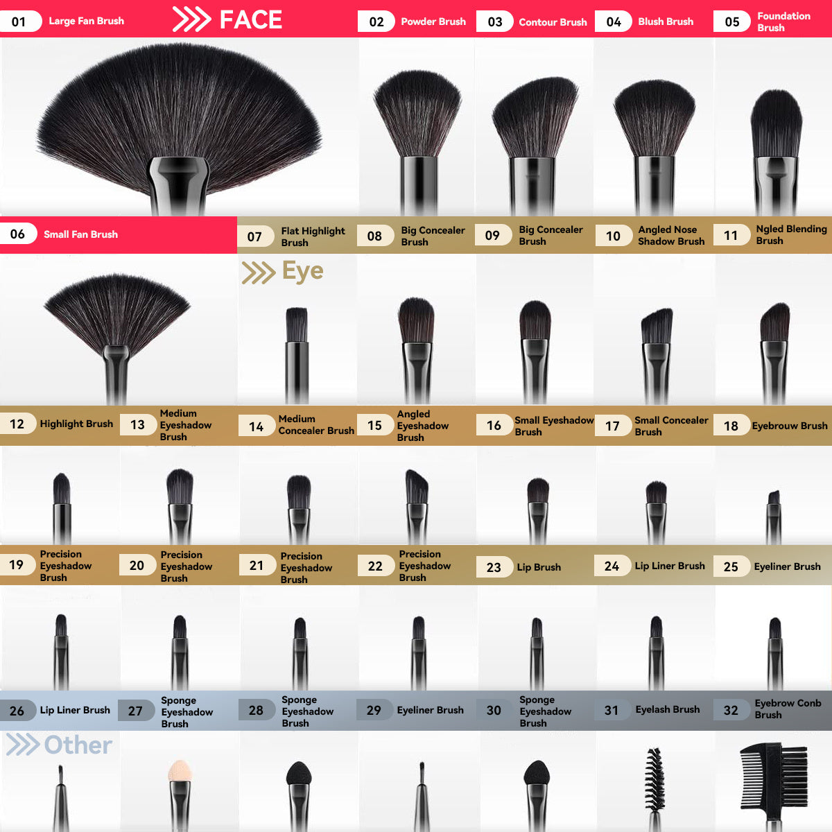 Total 32pcs Cosmetics Makeup Brushes Contains Powder Brush