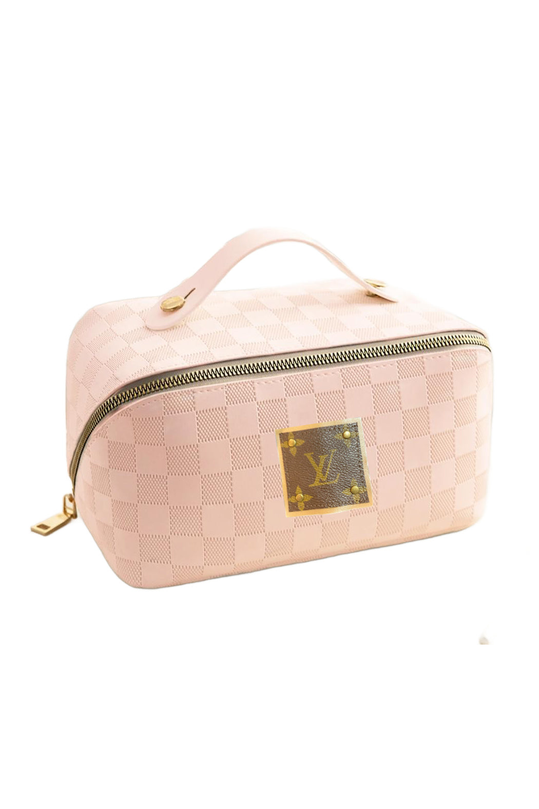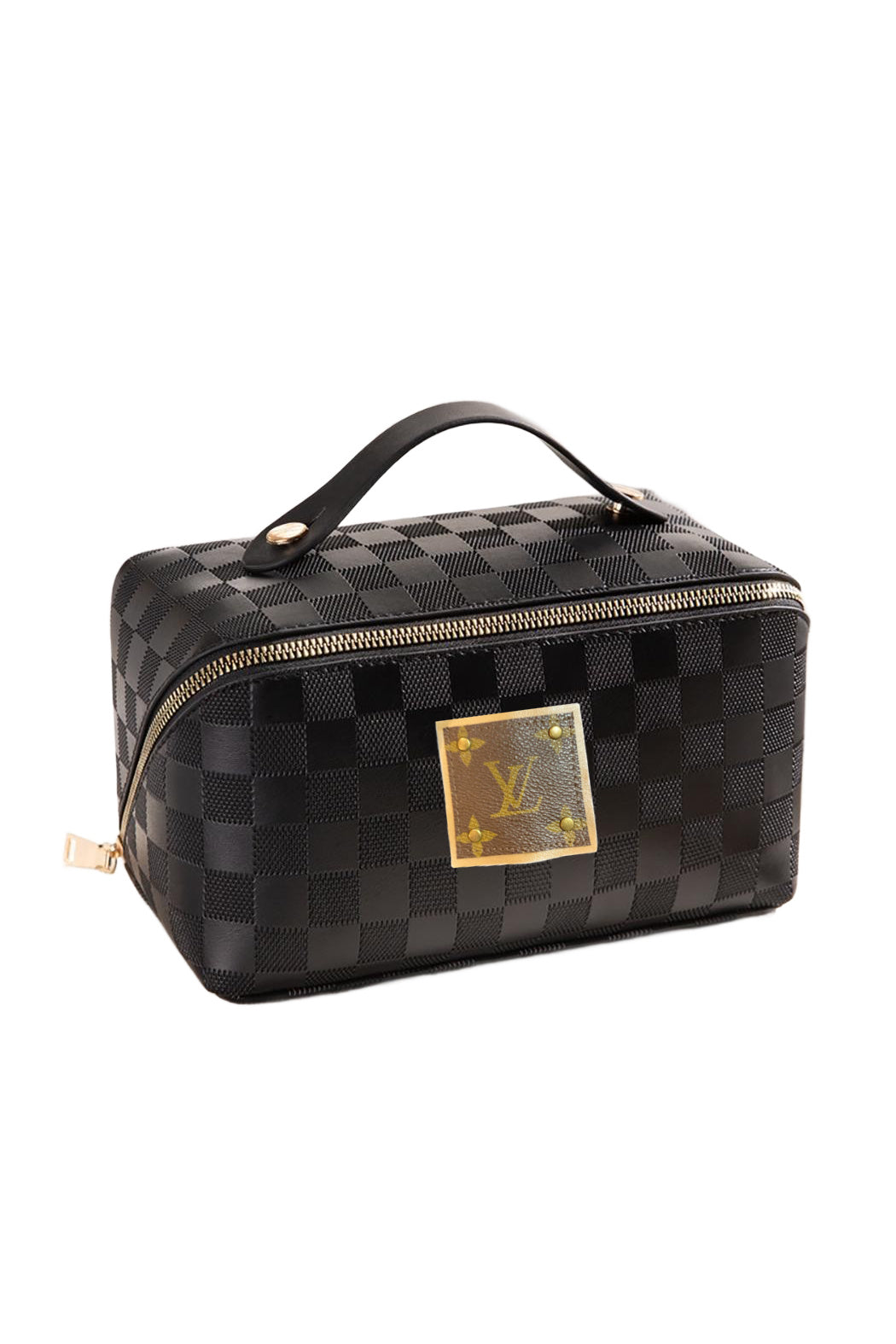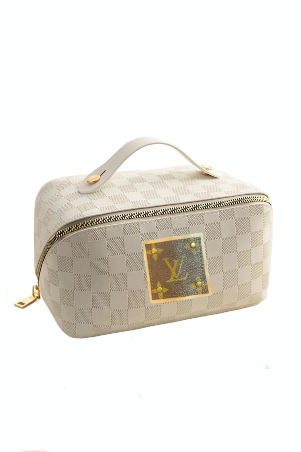 Travel in style with our Upcycled Checkered Tone Make Up Pouch! With an authentic Louis Vuitton detail sewn on leather and a full zipper closure, this pouch is both fashionable and functional. Keep your makeup organized with 3 internal side pockets and 1 zipper brush pocket. Plus, the center lays flat when opened for easy access. Measuring approximately 8.5" W x 5" T x 7" D, this pouch is perfect for all your travel and makeup needs.