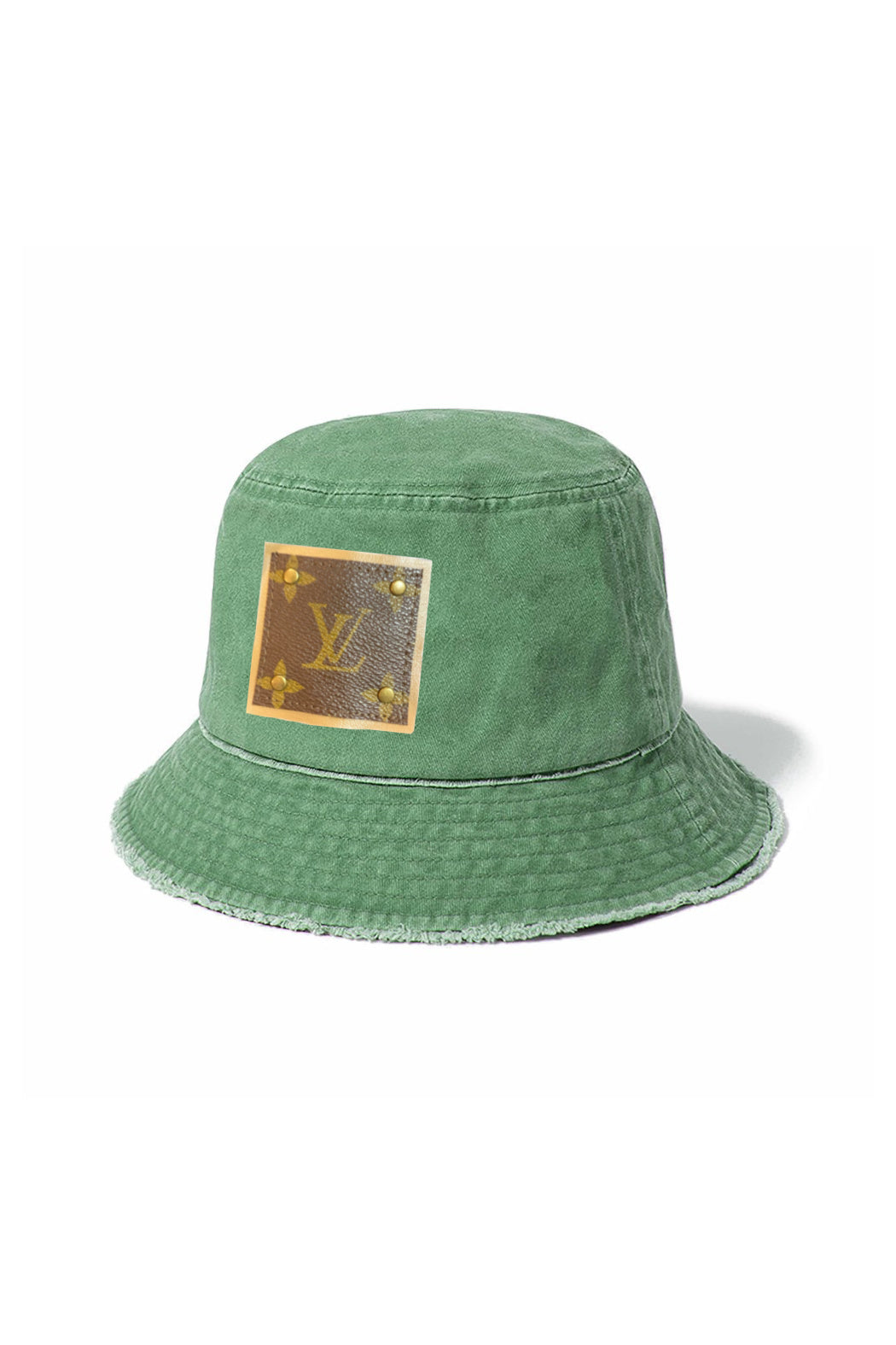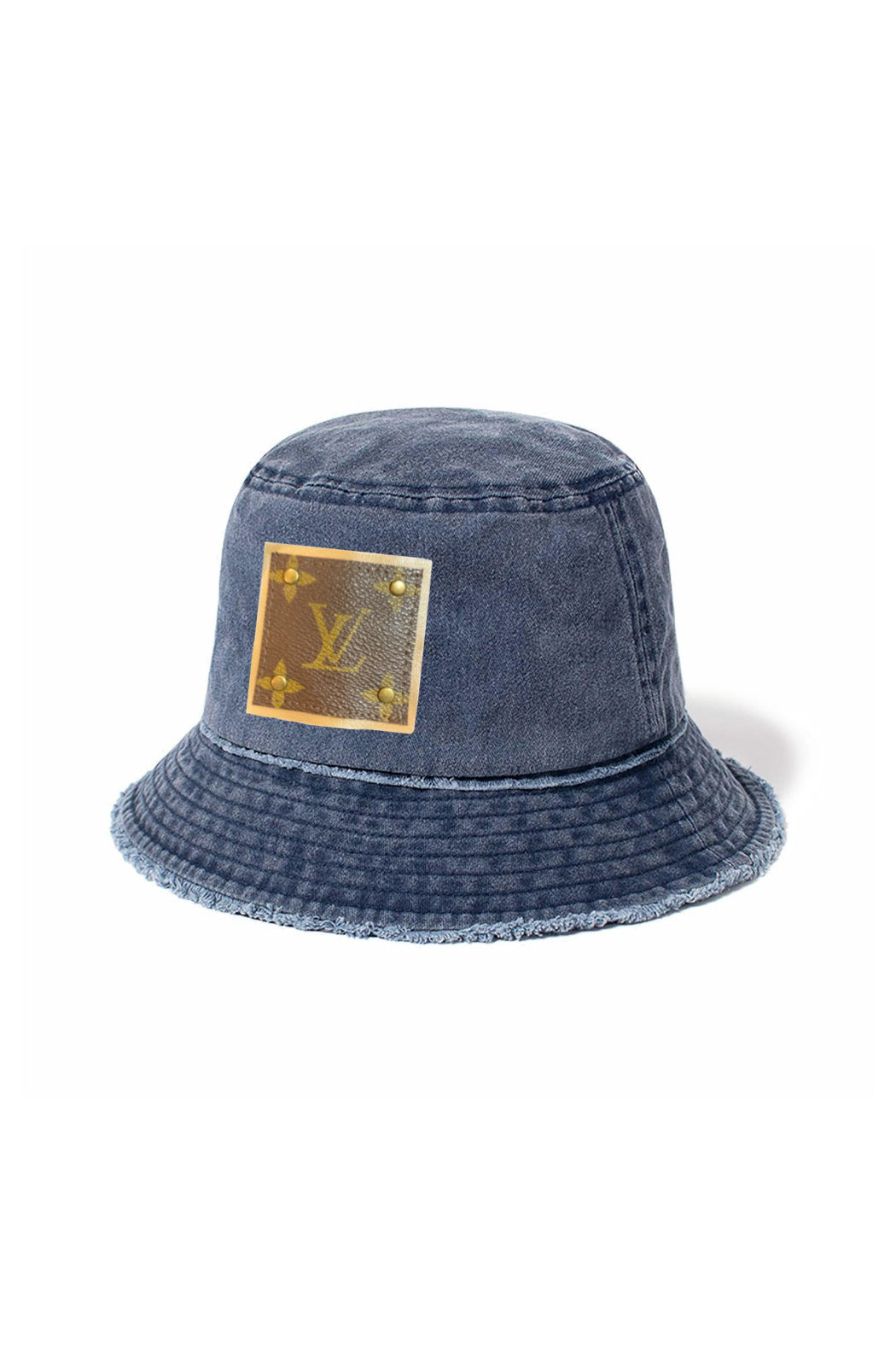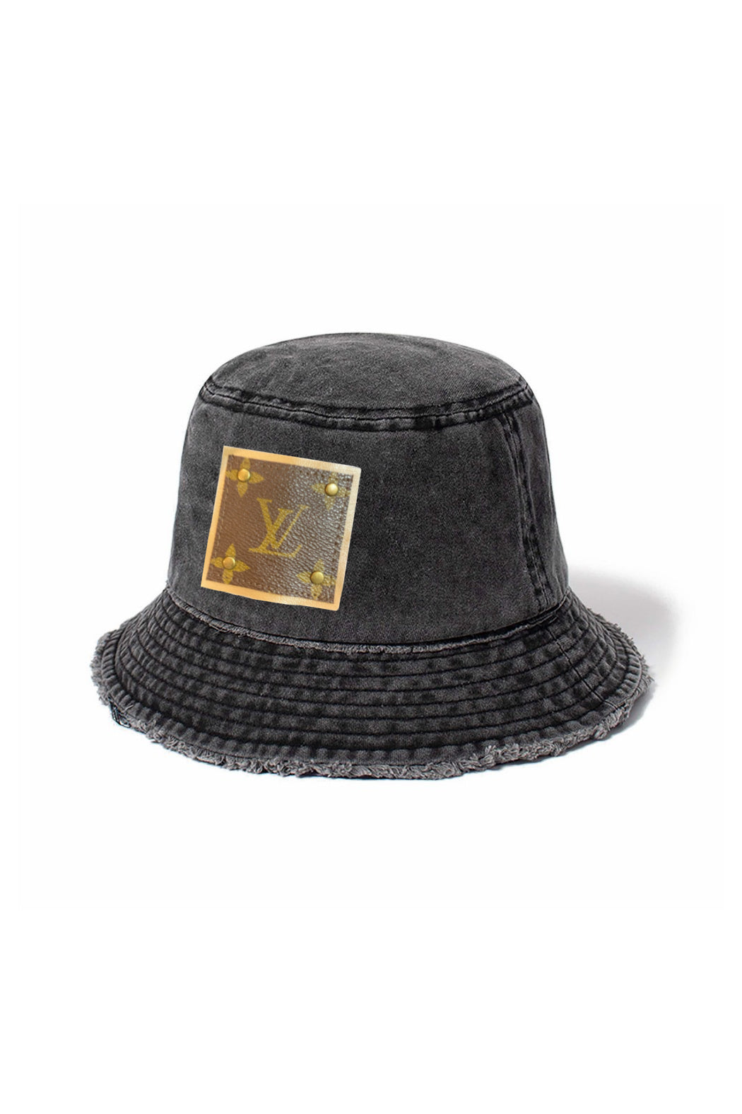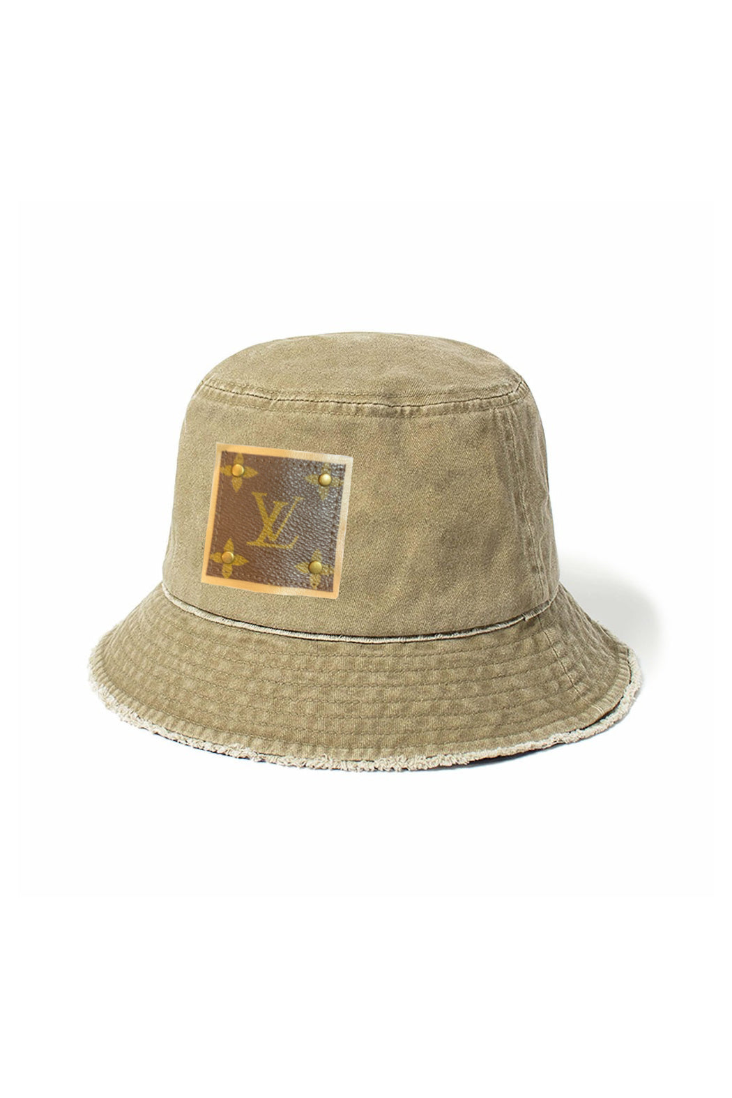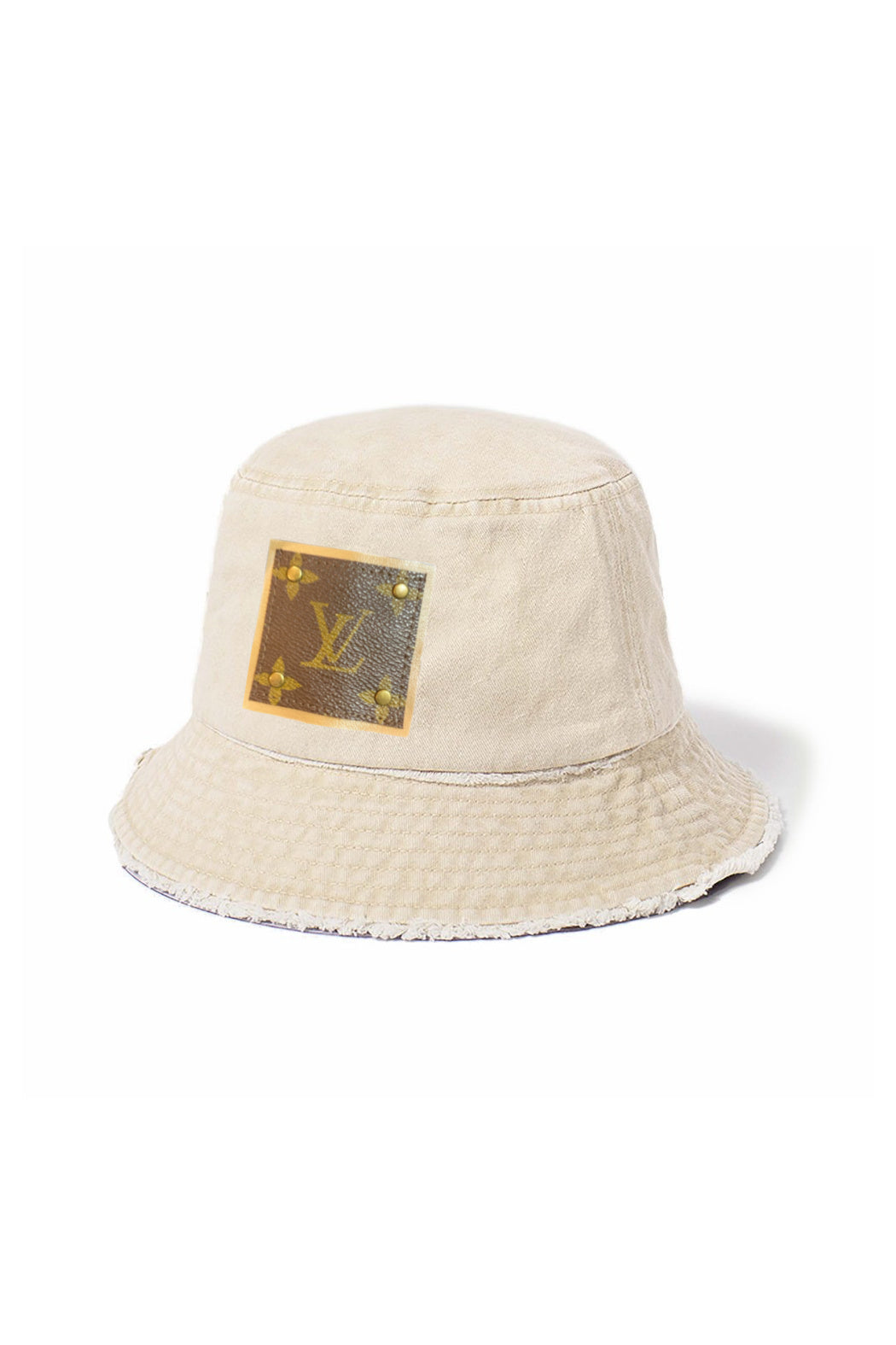 This short fringed edge bucket hat features an upcycled Louis Vuitton material detail, with the patch securely sewn onto the leather base with rivets. The hat is made of a soft 100% cotton fabric.