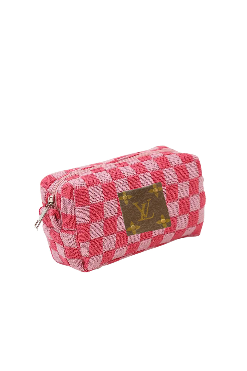 This Upcycled Travel Pouch is crafted from a checkered, woven polyester blend fabric, designed to be durable and stylish. It features a full zipper closure and is lined in white fabric for extra protection. Perfect for keeping all your belongings safe and organized during your travels. Upcycled with authentic Louis Vuitton materials and adhered and riveted on the front. 6.5"W x 4"H x 2.5"D.