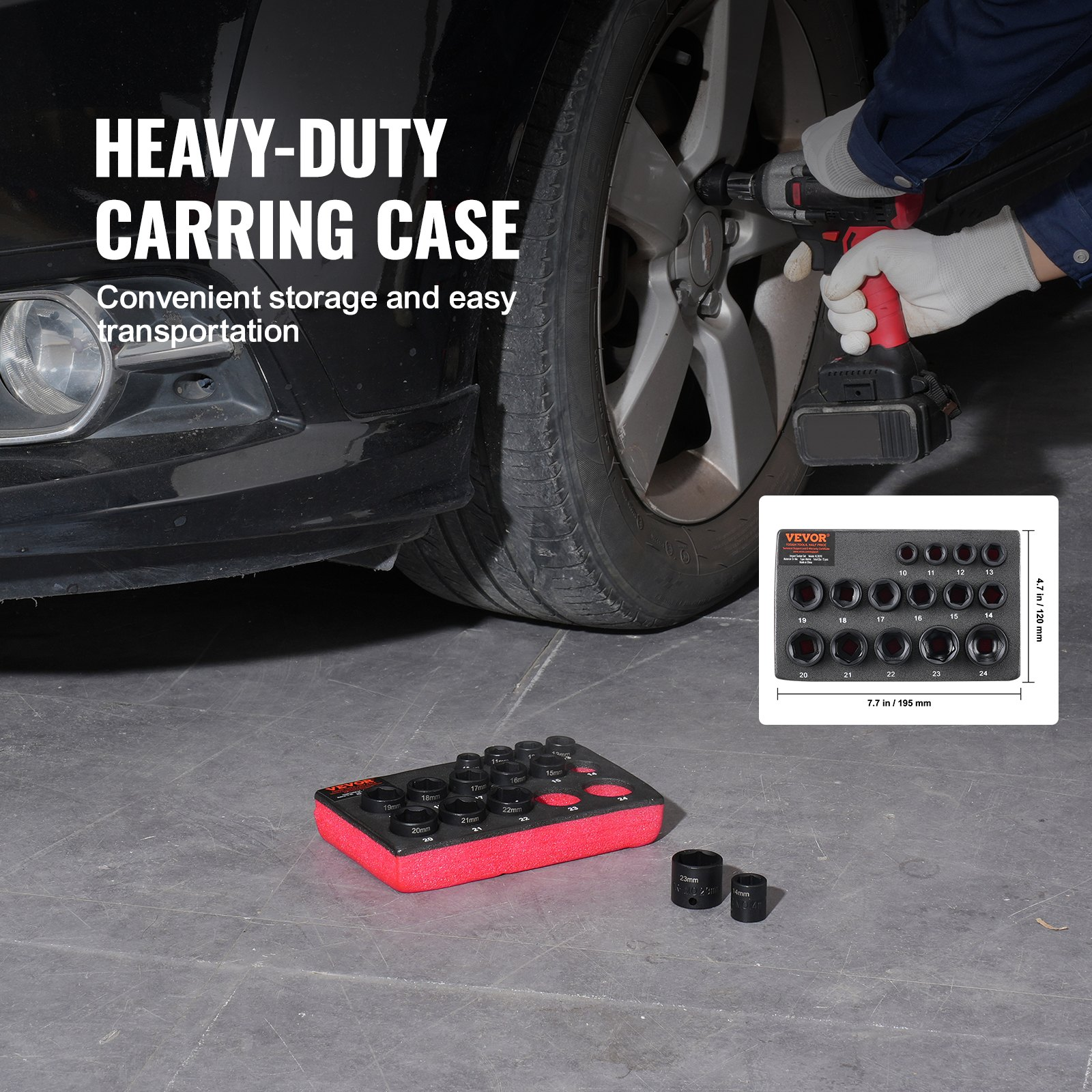 VEVOR Impact Sockets Set 15pcs 6-Point 3/8" Drive Bit Ratchet Tool Kit Case