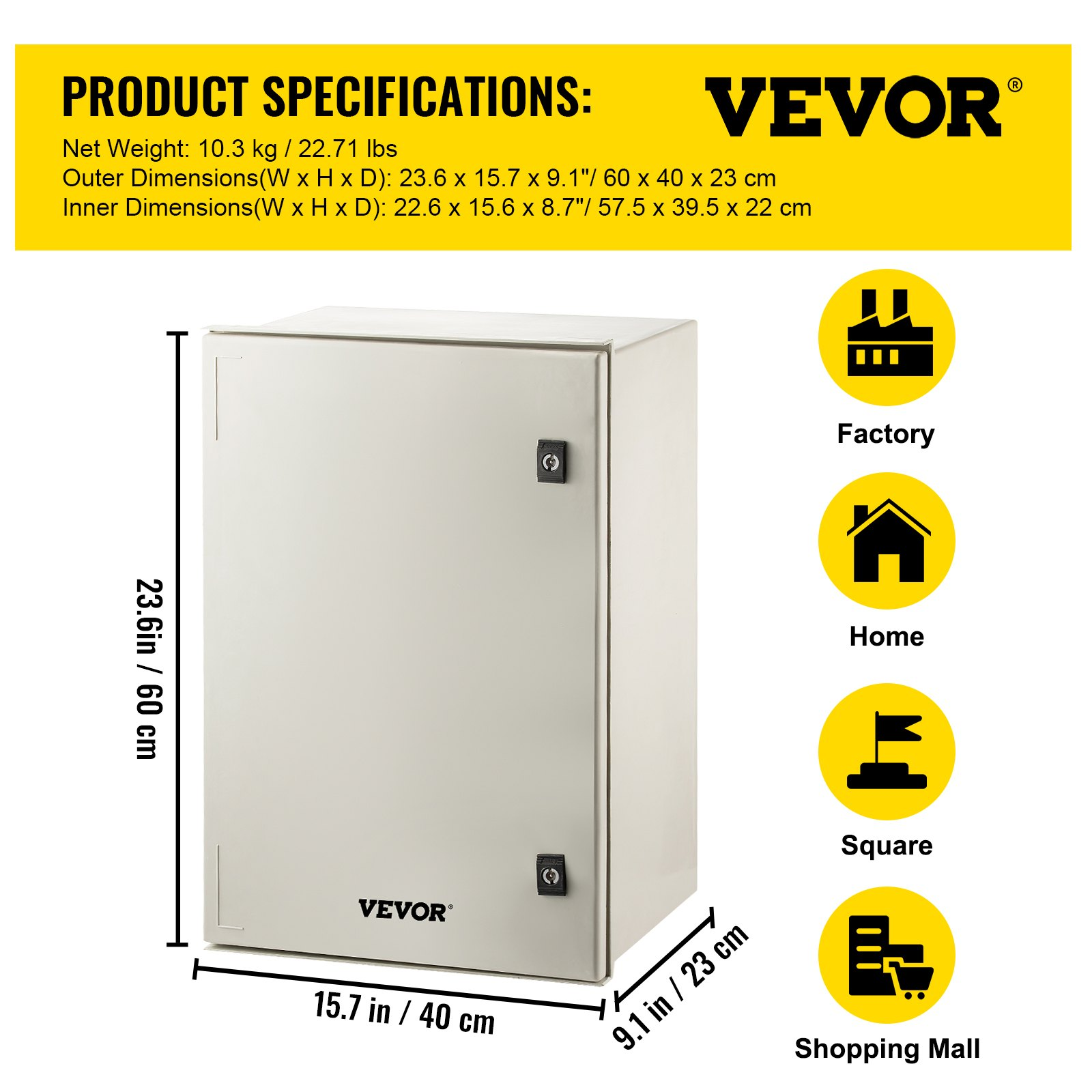 Outer Dimensions(H x W x D): 23.6 x 15.7 x 9.1"/60 x 40 x 23 cm,Inner Dimensions(H x W x D): 22.6 x 15.6 x 8.7"/57.5 x 39.5 x 22 cm,Mounting Plate: Galvanized Back Plate,IP Rating: IP66,Material: SMC,Mounting Type: Wall-Mount,Net Weight: 22.71 lbs/10.3 kg,Application: Indoor/Outdoor,NEMA Rating: NEMA Type 3, 3X